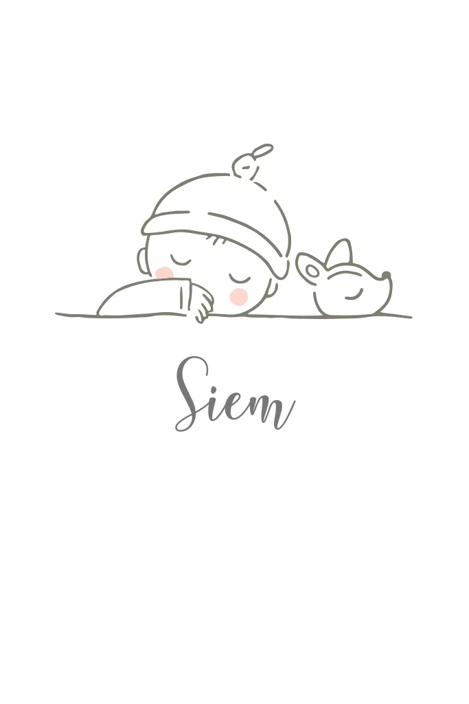 Enkel geboortekaartje met een slapende baby met knuffel in grijze lijntekening met spetters en een hartje in goudfoliedruk. Aan de achterzijde van de kaart staan de spetters en de icoontjes ook in goudfolie.