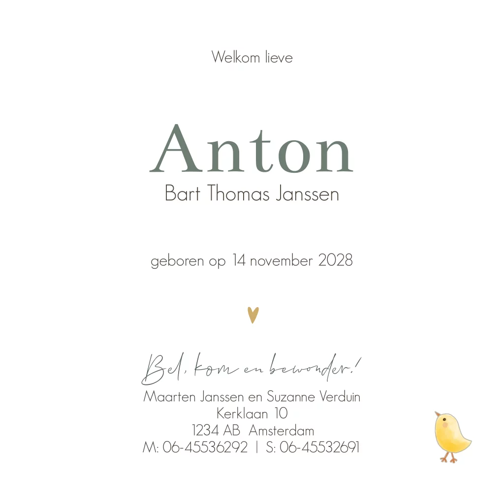 Vrolijk en lief geboortekaartje met een klein geitje, twee kuikentjes en een vlindertje.