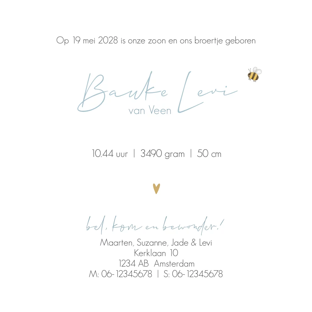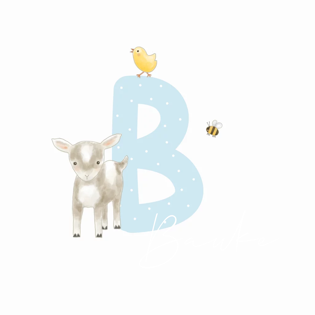 Geboortekaartje met de letter B als initiaal met een geitje, kuikentje en een bijtje ernaast. De naam staat in goudfolie.