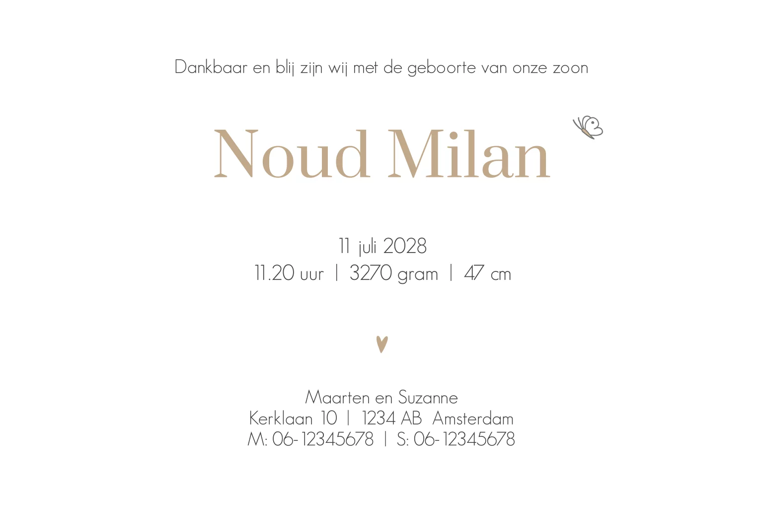 Geboortekaart voor een jongen met in baby en grote broer in lijntekening met wolkjes, de zon, bloemen, gras en vlinders eromheen op een lichte grijs bruine achtergrond met wit ovaal.