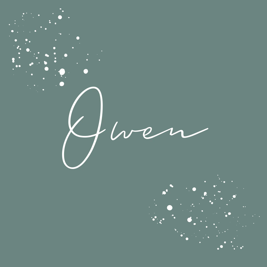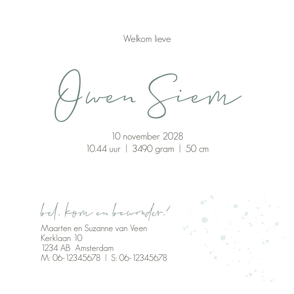 Geboortekaart voor een jongen met de naam en spetters in goudfolie op een warm groen gekleurde achtergrond. De achtergrond kleur en folie is aan te passen. Heb je liever geen folie, maar een gewone kleur kan dit natuurlijk ook.