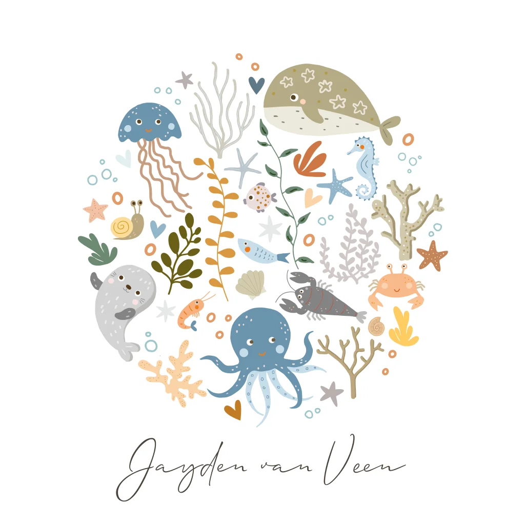 Geboortekaart voor een jongen met verschillende zeedieren als een warvis, octopus, vissen, zeepaardje en zeehond met koraal, sterren, hartjes en stippen in een cirkel. Enkele stipjes in de cirkel staan in goudfolie. Deze stippen zijn in kleur aan te passen.
