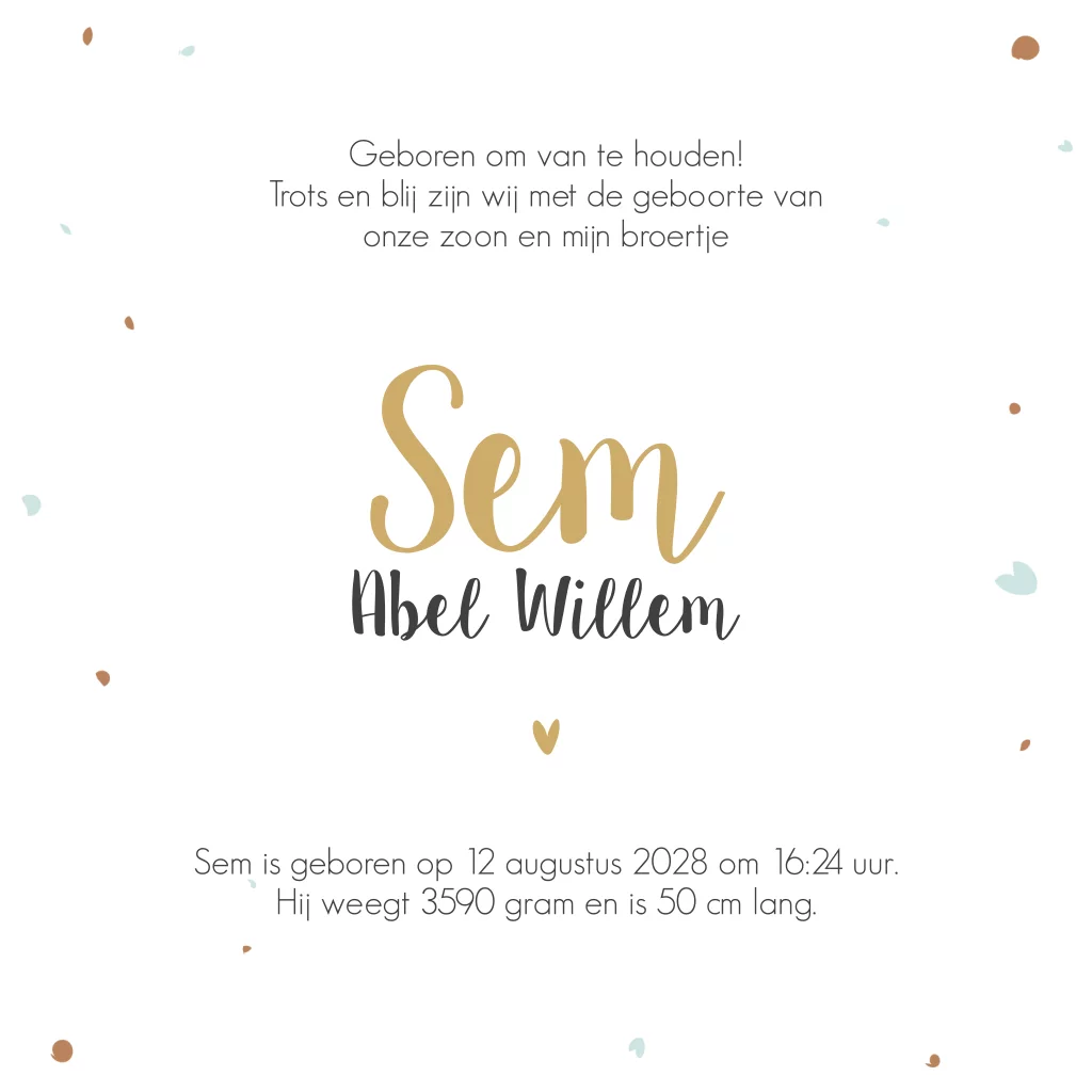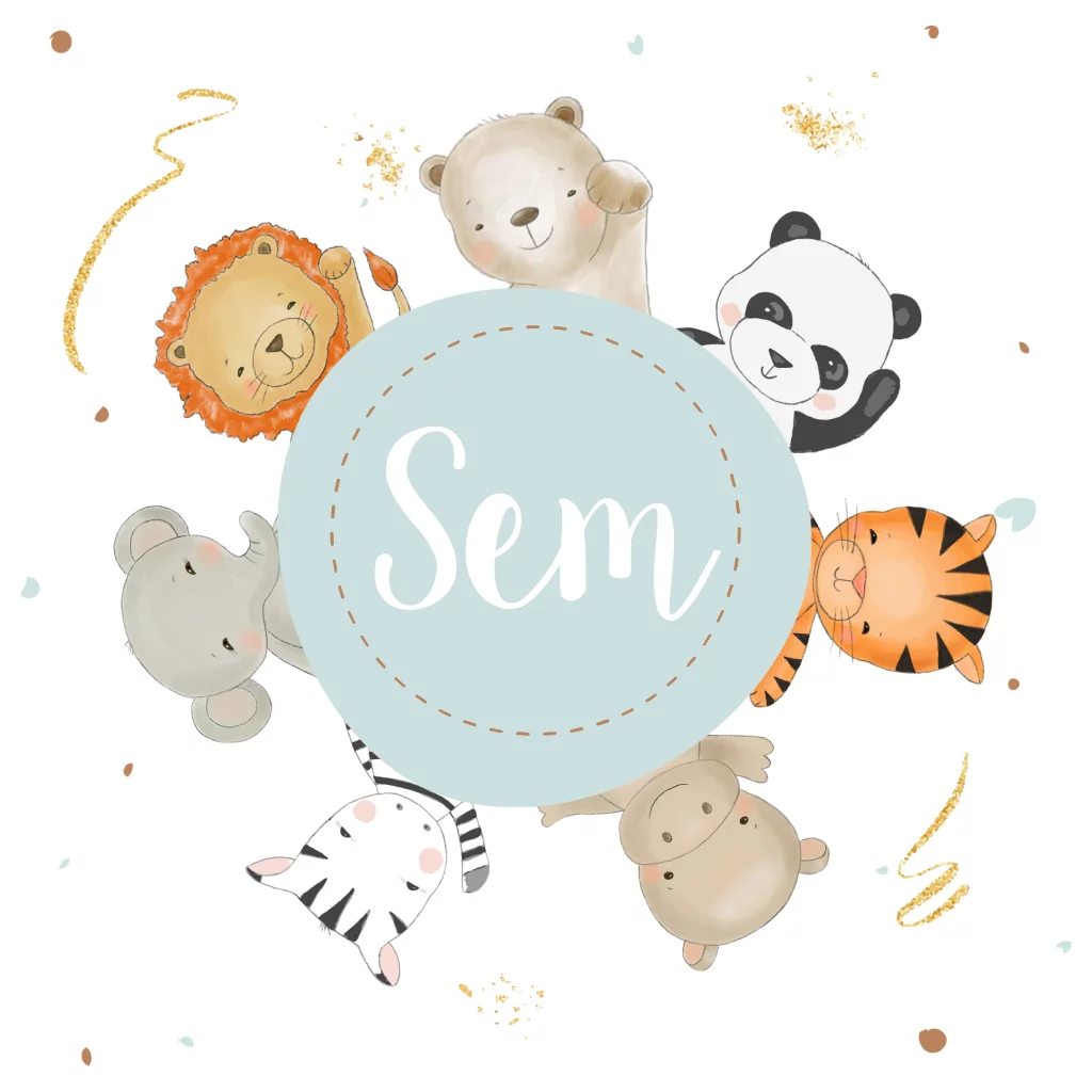 Vrolijk geboortekaartje voor een jongen met verschillende jungle dieren als een beertje, panda, tijgertje, nijlpaard, zebra, olifant en leeuw rondom een grijs mintgroen gekleurde cirkel met daarin de naam van de baby. In de achtergrond staan gekleurde spatten en gouden glitters.