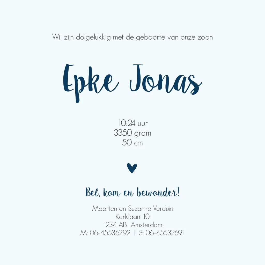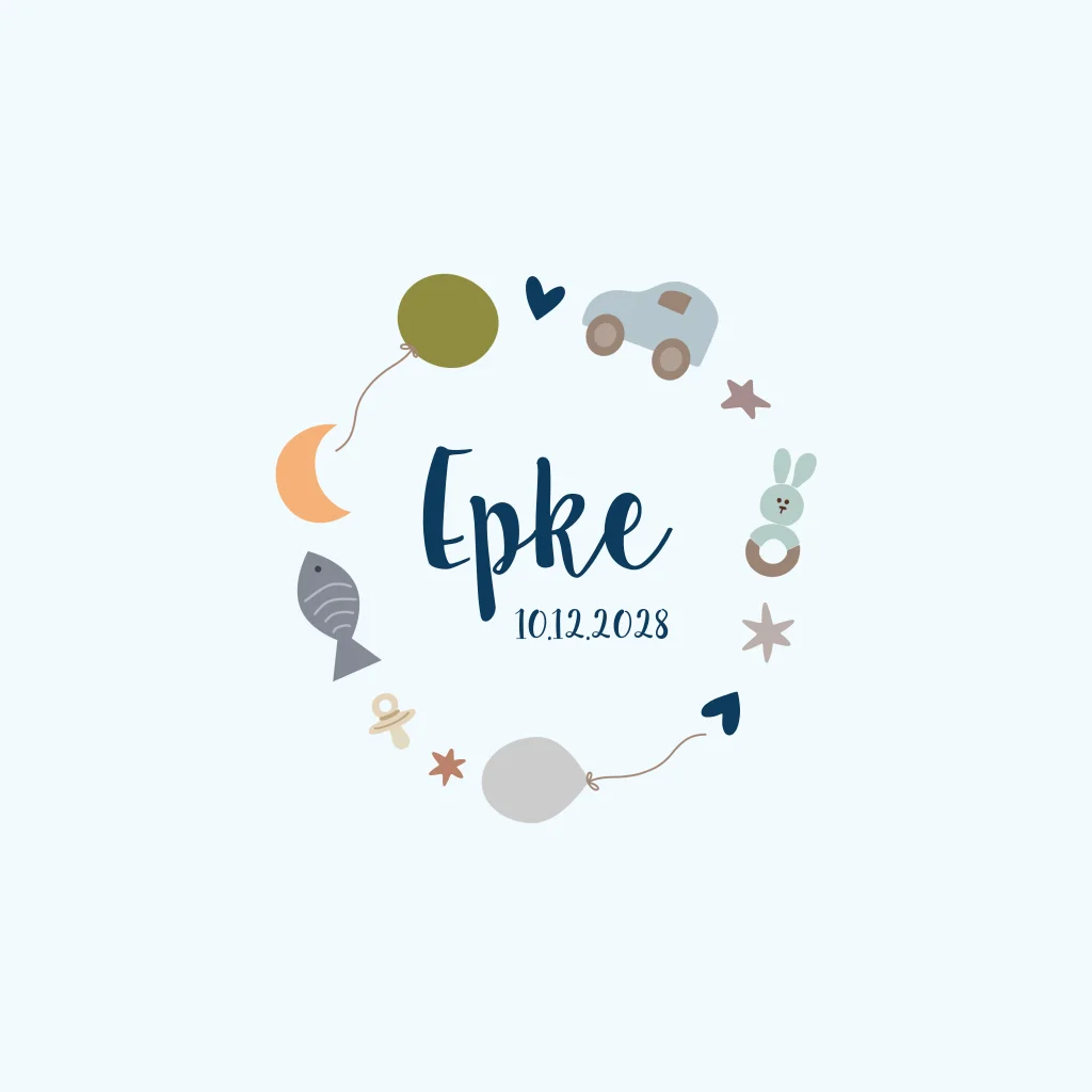 Geboortekaartje voor een jongen met kleine elementen als een auto, ballon, rammelaar, hartjes en sterren in een cirkel met daarin de naam en geboortedatum.