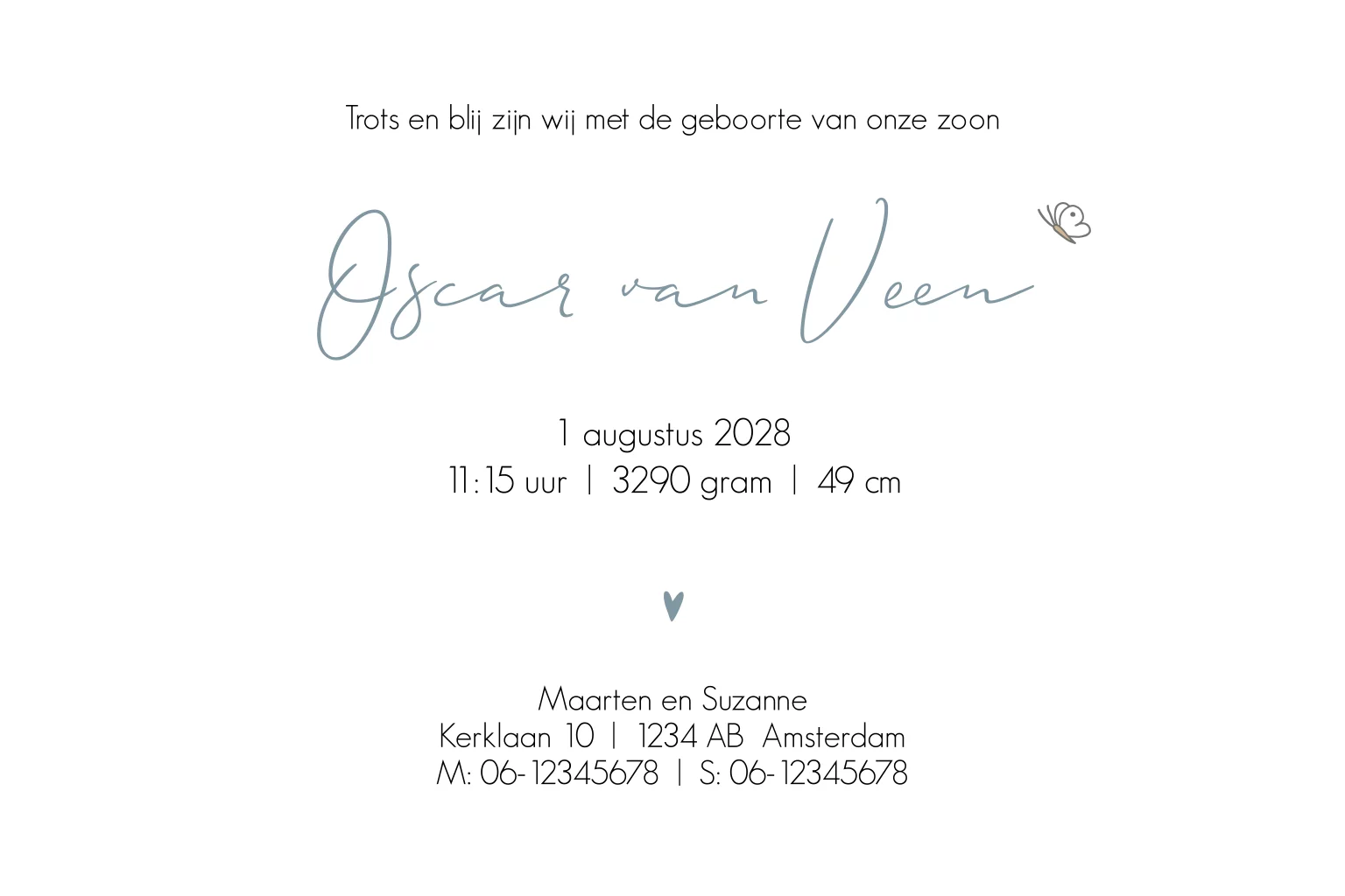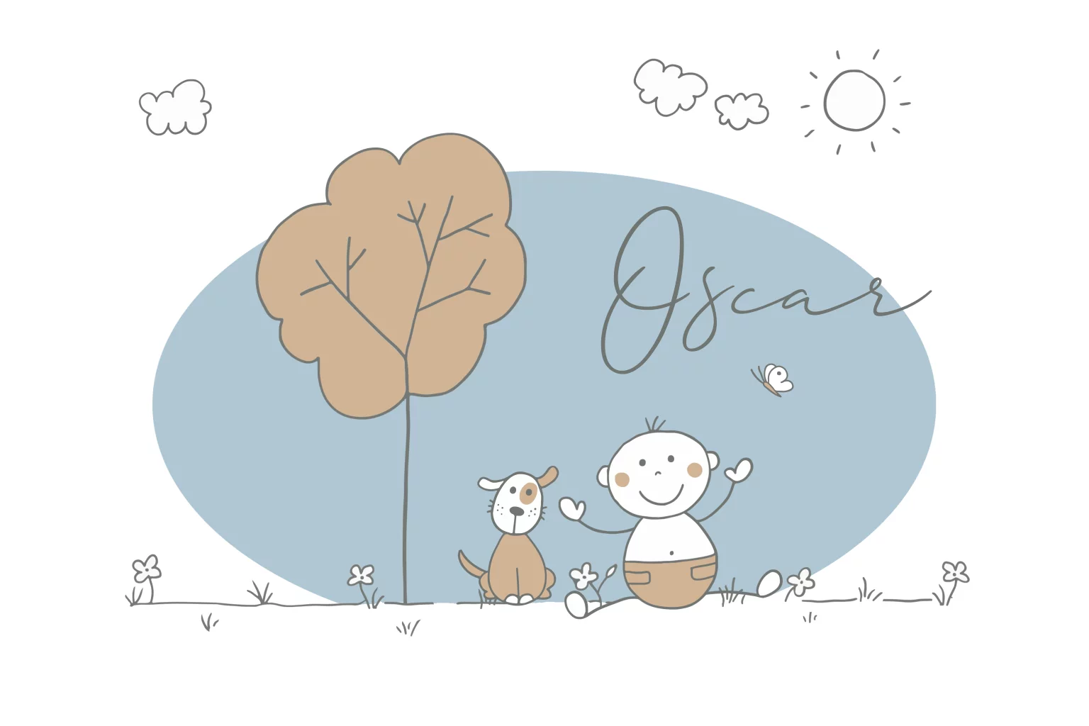Geboortekaartje voor een jongen met in lijntekening een baby met hond onder een boom met wolkjes, de zon, een vlinder, gras en bloemen op een blauwe ovaal in de achtergrond.