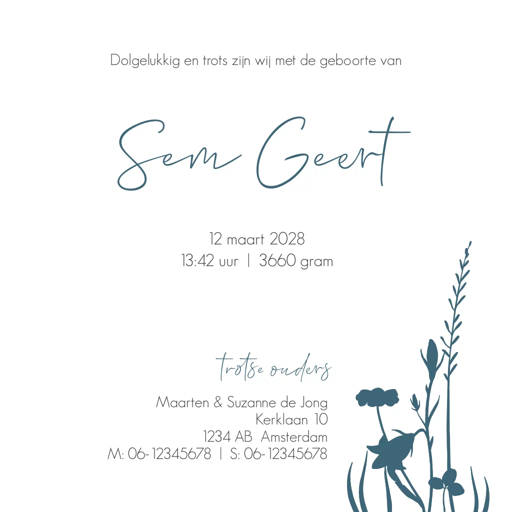 Geboortekaartje voor een jongen met een baby, vlindertje en bloemen in silhouette en een lichtblauw vlak in de achtergrond. De kaart is gemakkelijk naar wens aanpasbaar.