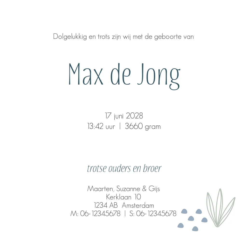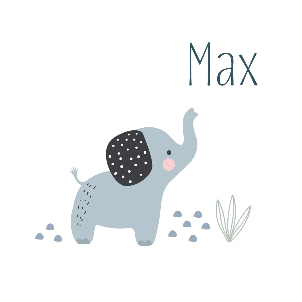 Geboortekaart voor de geboorte van een zoon met een lief blauw olifantje met steentjes en een plantje erbij. De laatste elementjes zijn in kleur aanpasbaar.