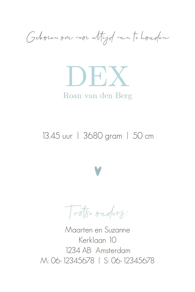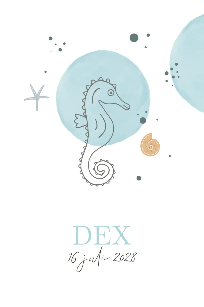 Geboortekaart voor een jongen met een illustratie van een zeepaardje in lijntekening met blauwe watercolor cirkels, stippen en een zeester. De stippen, het zeepaardje en de cirkels zijn in kleur aan te passen.