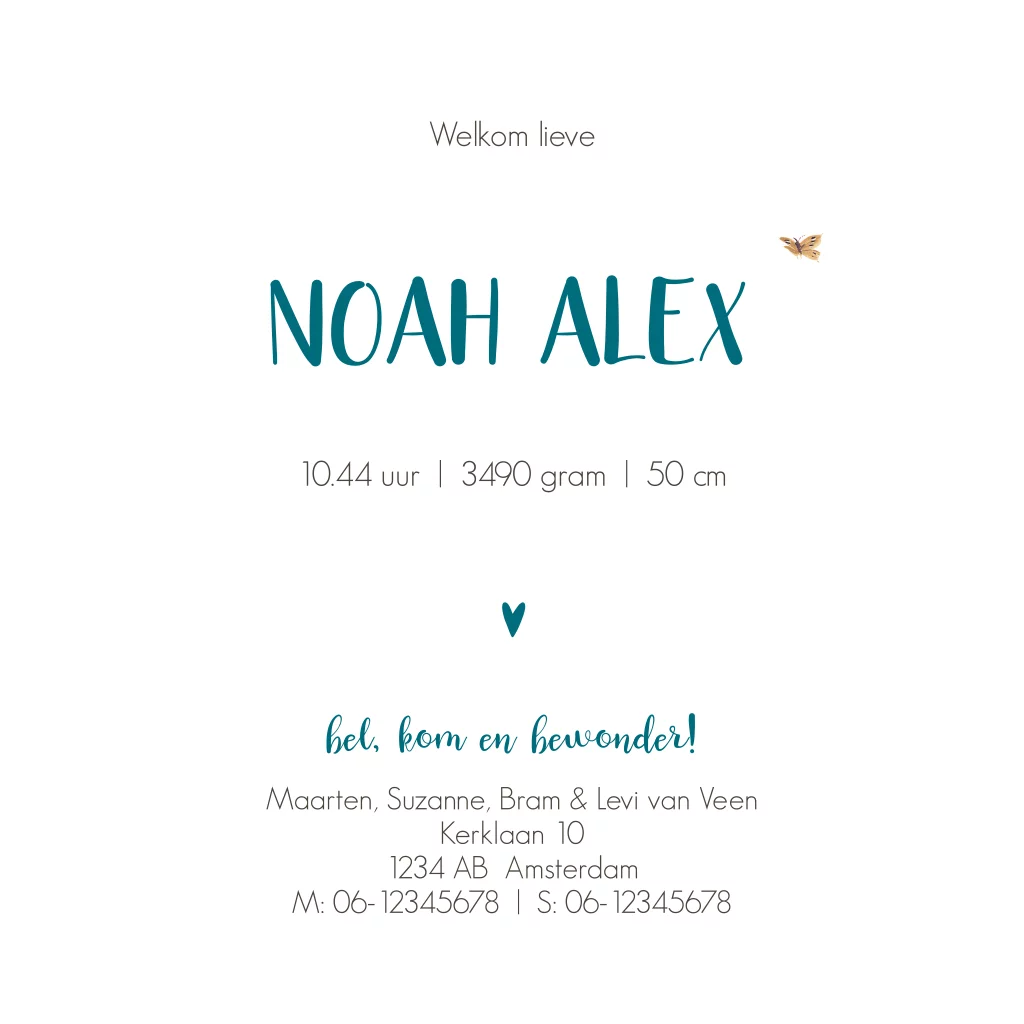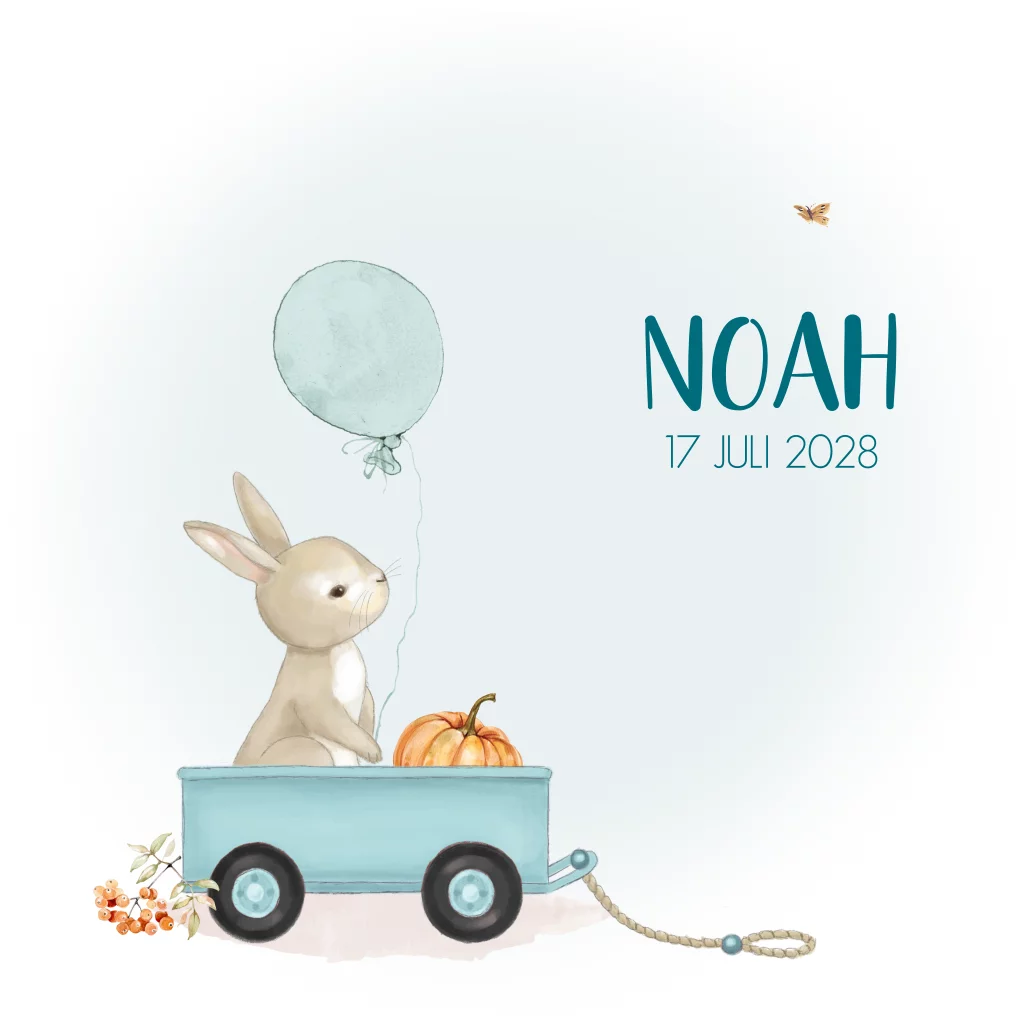 Lief geboortekaartje voor de geboorte van een zoon met de illustratie van een konijn met een pompoen in een bolderwagen, een blauwe ballon en een vlindertje met blauwe watercolor in de achtergrond.