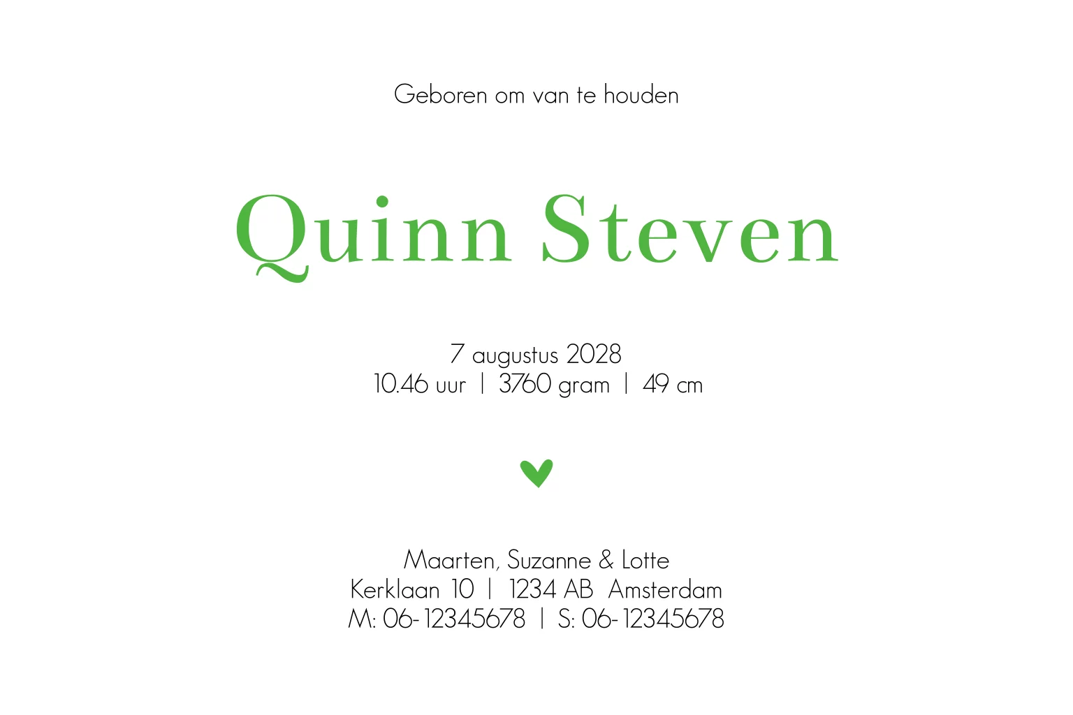 Eenvoudig en tijdloos geboortekaartje met de naam en het hartje aan de voorzijde in een frisse groene kleur met hoogglansfolie erover.