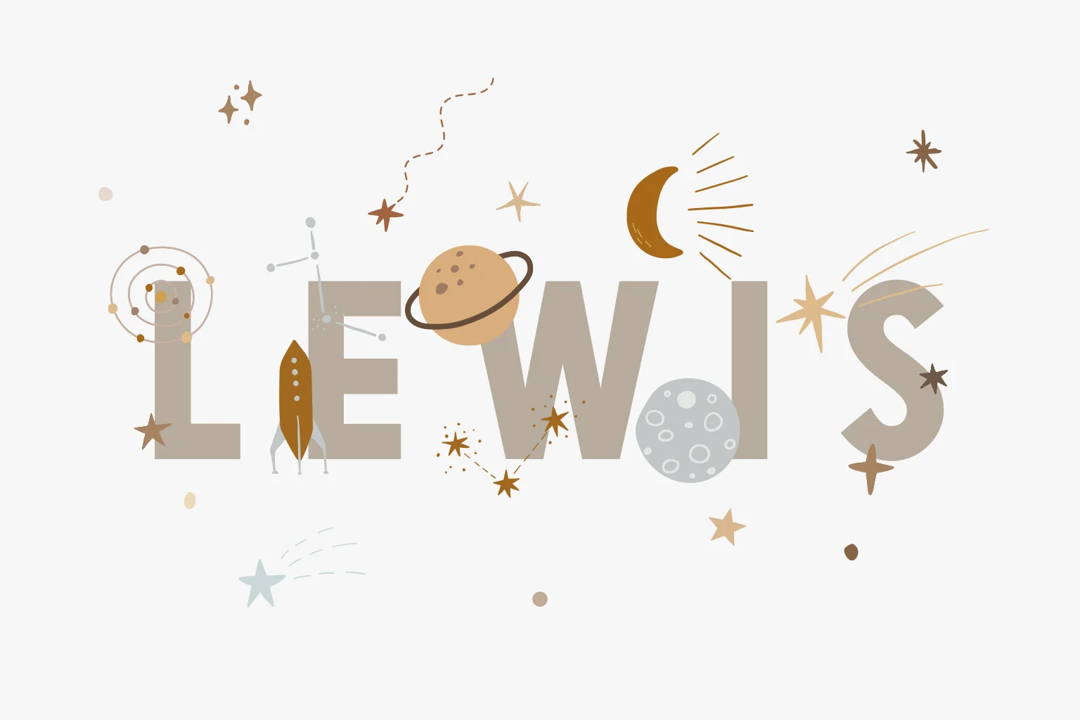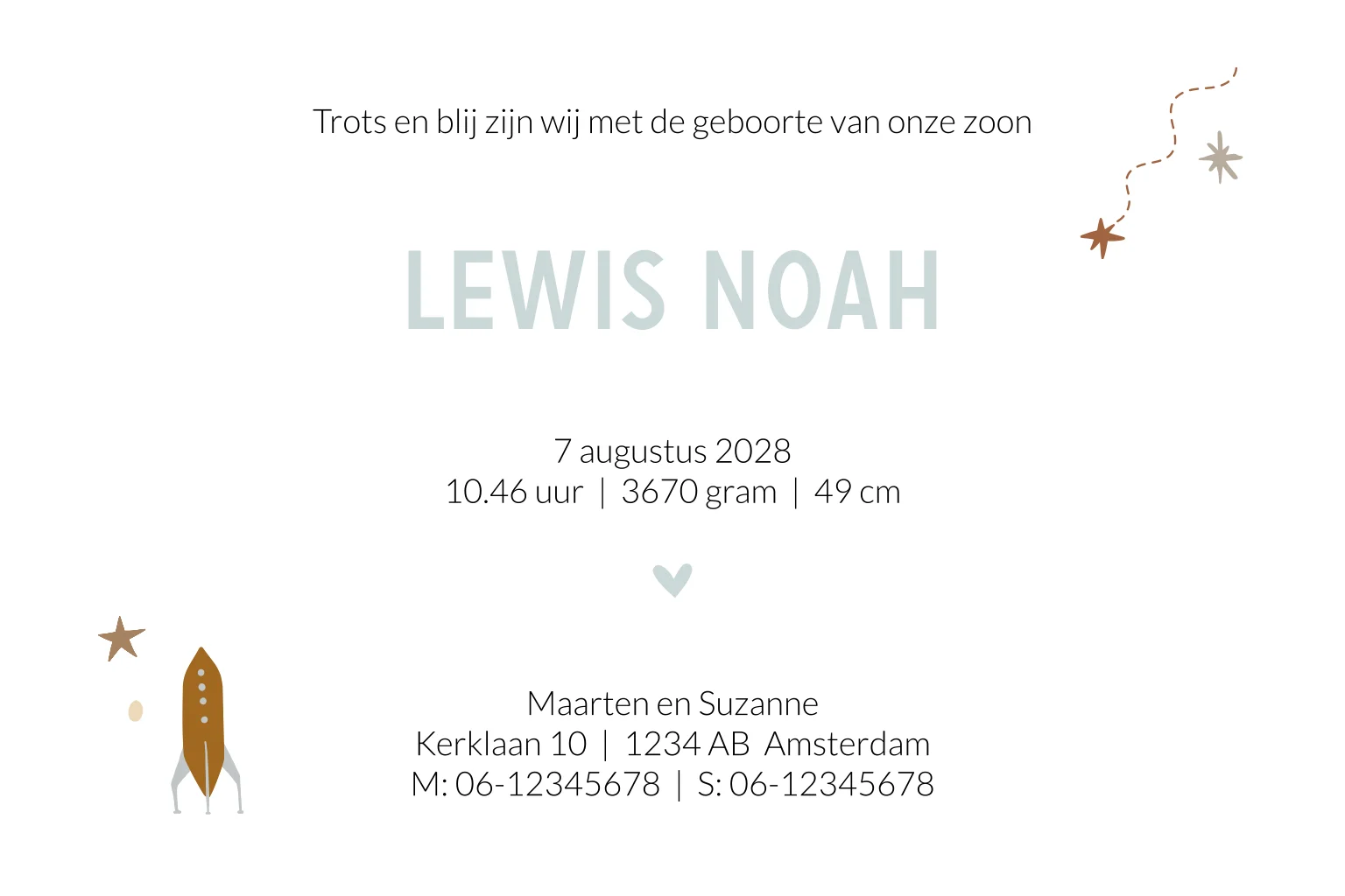 Een vrolijk geboortekaartje voor een jongen met galaxy elementen als planeten, sterren, een raket, stippen en melkwegen rondom de naam. Veel elementen zijn in kleur aan te passen.