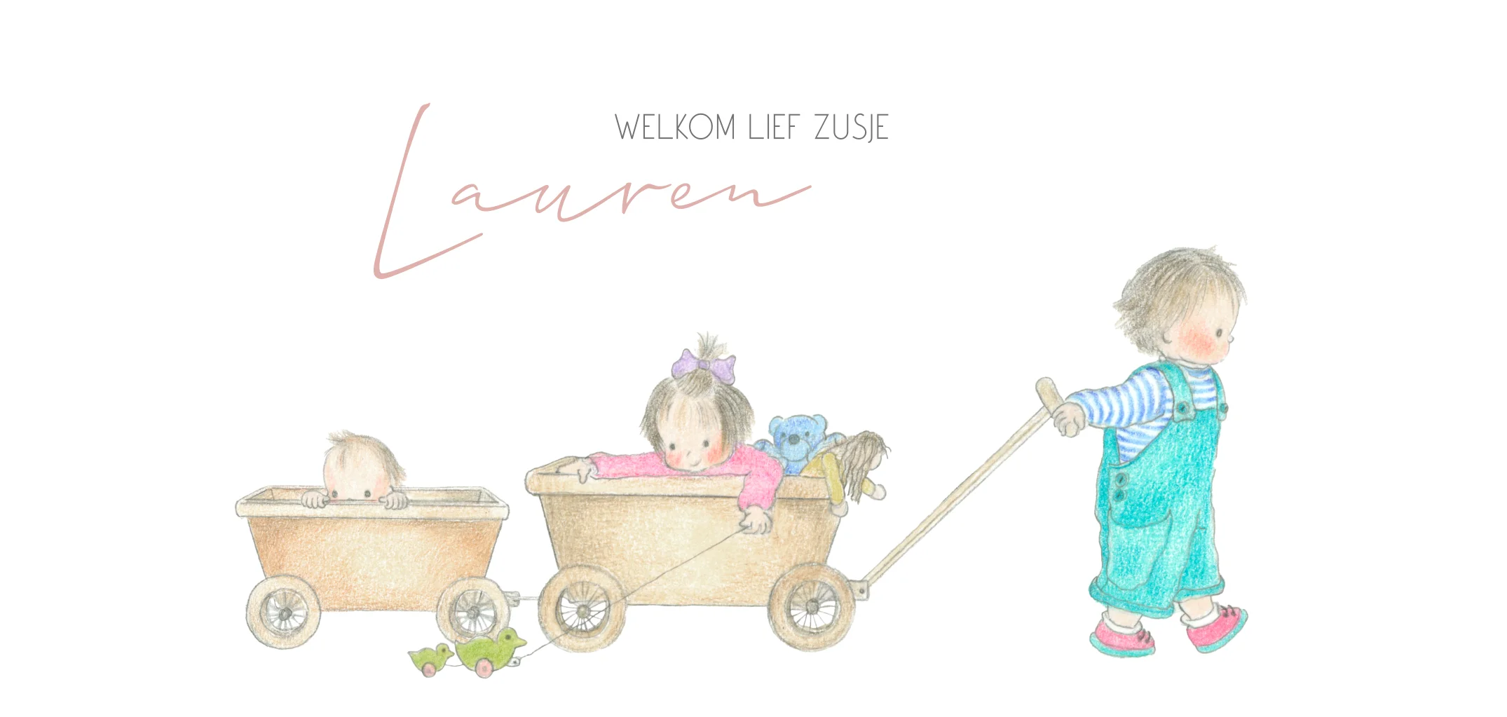Vrolijk getekend geboortekaartje met ronde hoeken voor de geboorte van een 3e kindje. Een baby en een grotere zus in een bolderkar en een grotere broer die de wagens voort trekt.