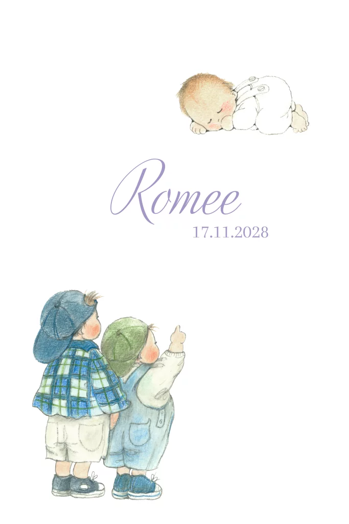 Lief geboortekaartje met een tekening in kleur van een lief slapende baby en 2 grote broers die samen naar de baby kijken.