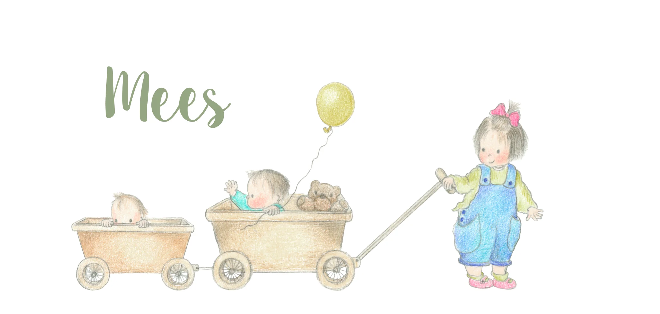 Vrolijk getekend geboortekaartje voor de geboorte van een 3e kindje. Een baby en een grotere broer in bolderwagens die beide getrokken worden door een grote zus.