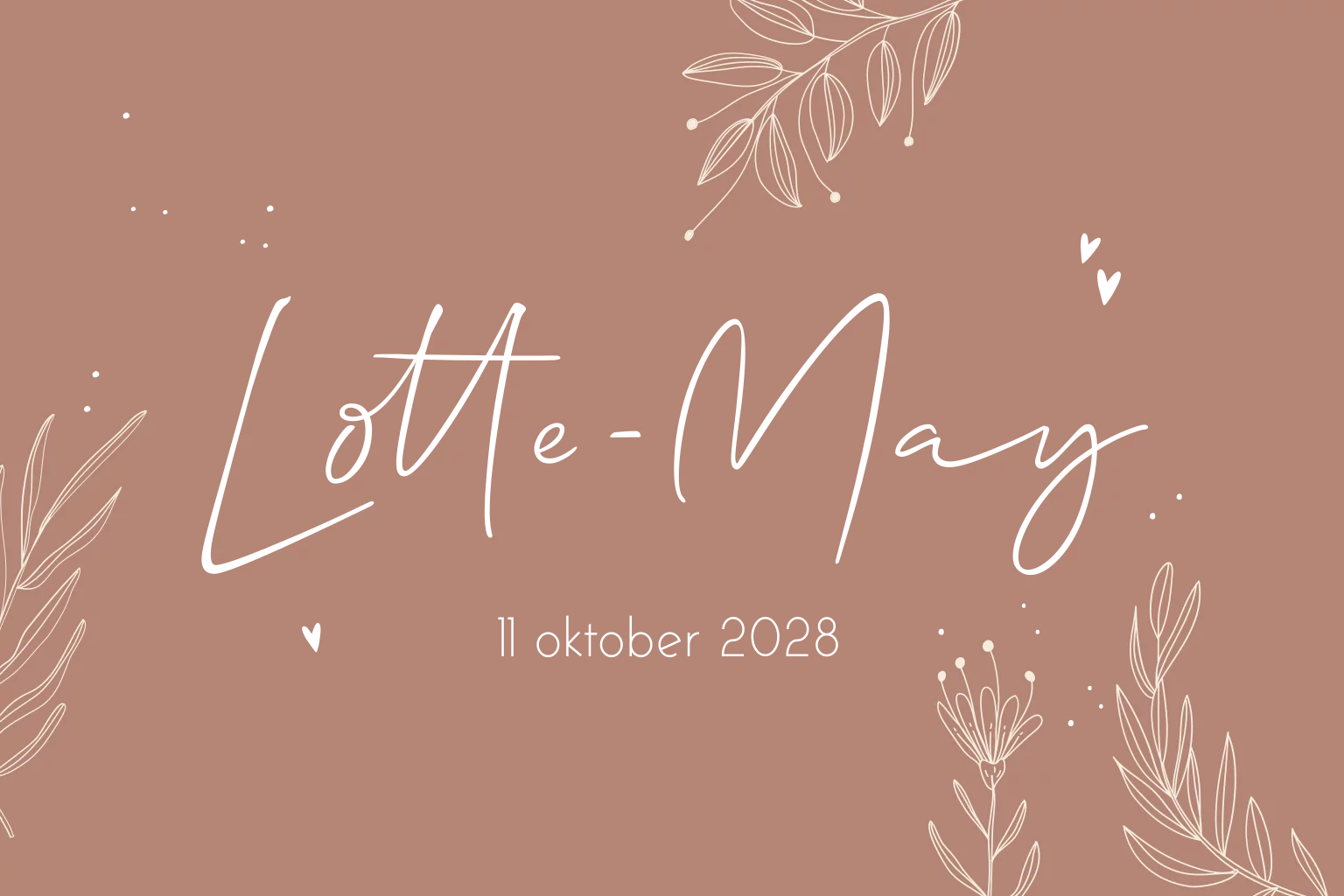 Mooi en lief botanisch geboortekaartje met de naam, datum, stippen en kleine hartjes in roségoudfolie en de takjes en bloem in het gebroken witte op de terra kleur achtergrond.