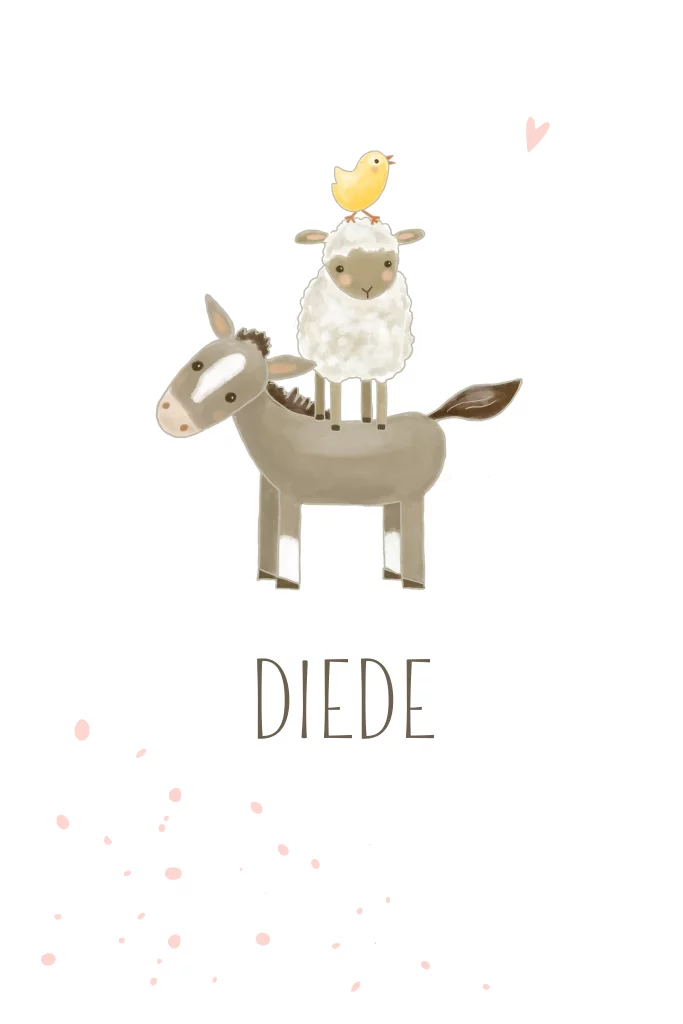Enkel geboortekaartje met boerderijdieren op elkaar. Een veulen, een lammetje en een kuikentje met een vlindertje. De spetters, het hartje en de icoontjes in zachtroze zijn in kleur aanpasbaar.