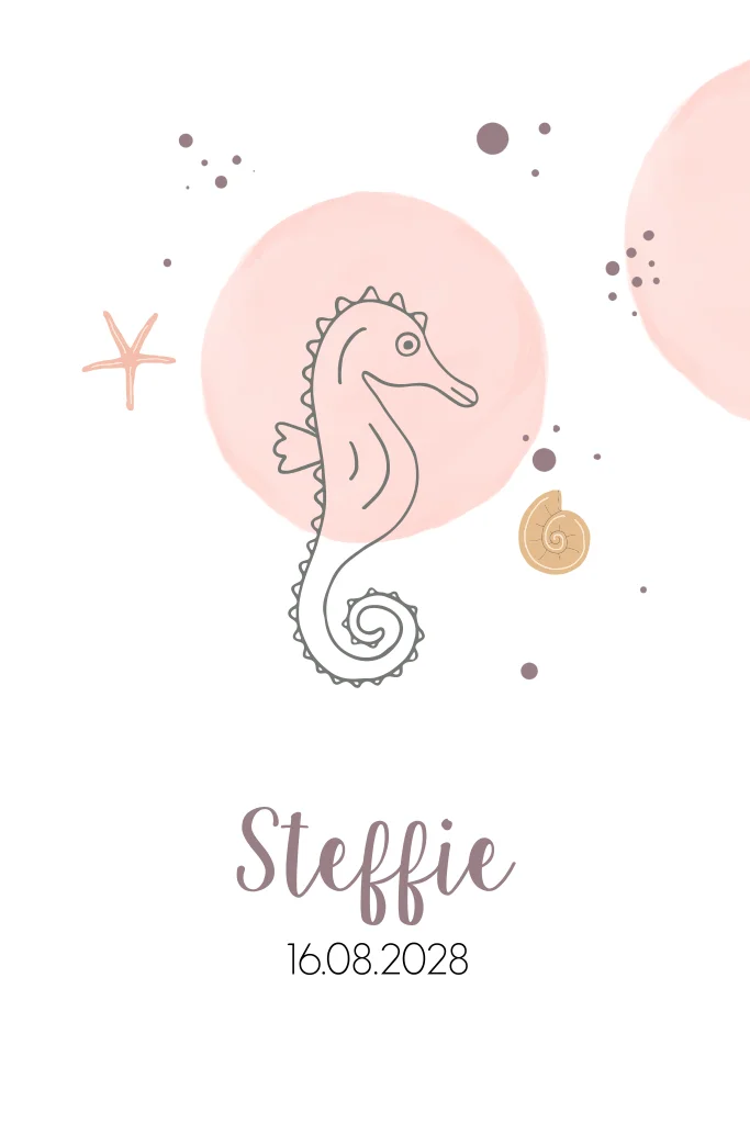 Enkel geboortekaartje met ronde hoeken met een illustratie van een zeepaardje in lijntekening met zachtroze cirkels, een zeester en taupe kleurige stippen. De cirkels, de stippen en het zeepaardje zijn in kleur aan te passen.
