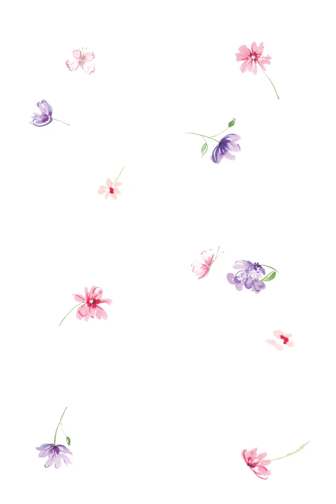Lief enkel geboortekaartje met ronde hoeken voor een meisje met paarse en roze bloemetjes en vlinders met de tekst, kleine hartjes en stippen aan de voorzijde in roségoudfolie.