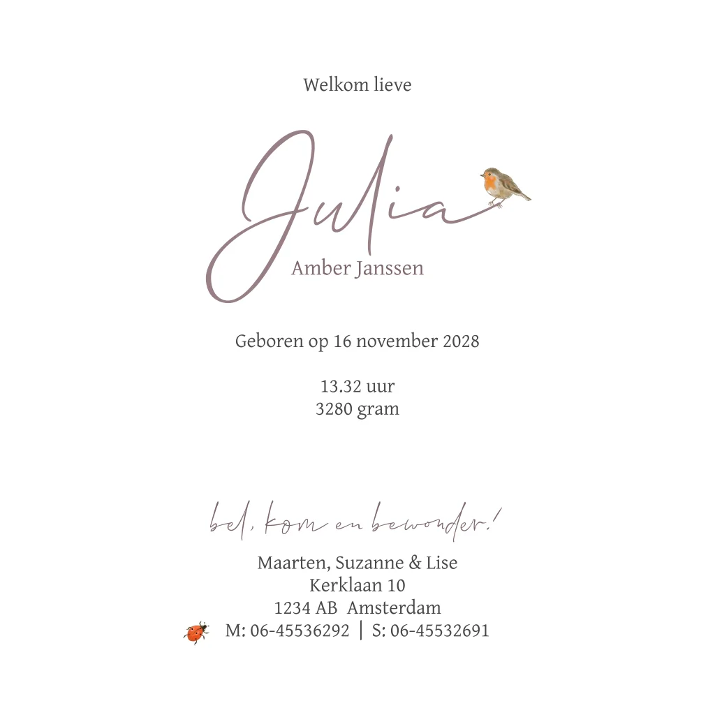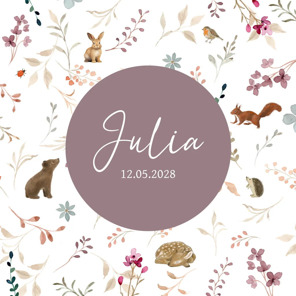 Hip geboortekaartje met mooie watercolor bloemen en takjes met kleine bosdieren als een hert, beer, konijn, egel, lieveheersbeestje en roodborstje ertussen. Taupe / paarse cirkel met de naam en geboortedatum erop. De kleur van de cirkel is aanpasbaar.