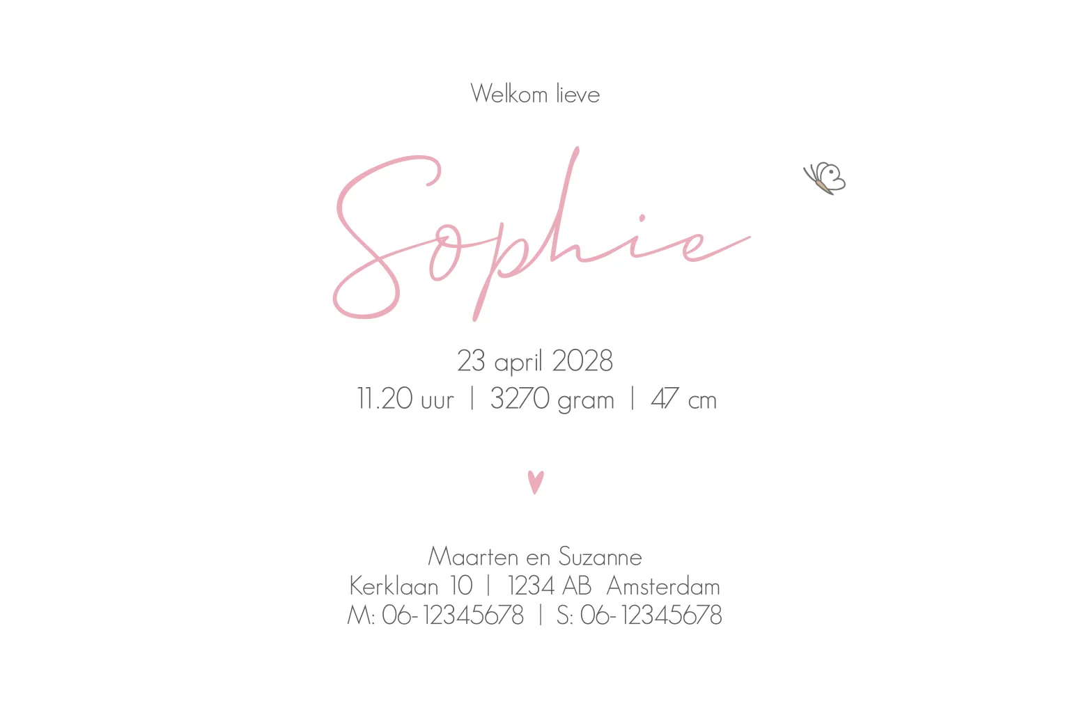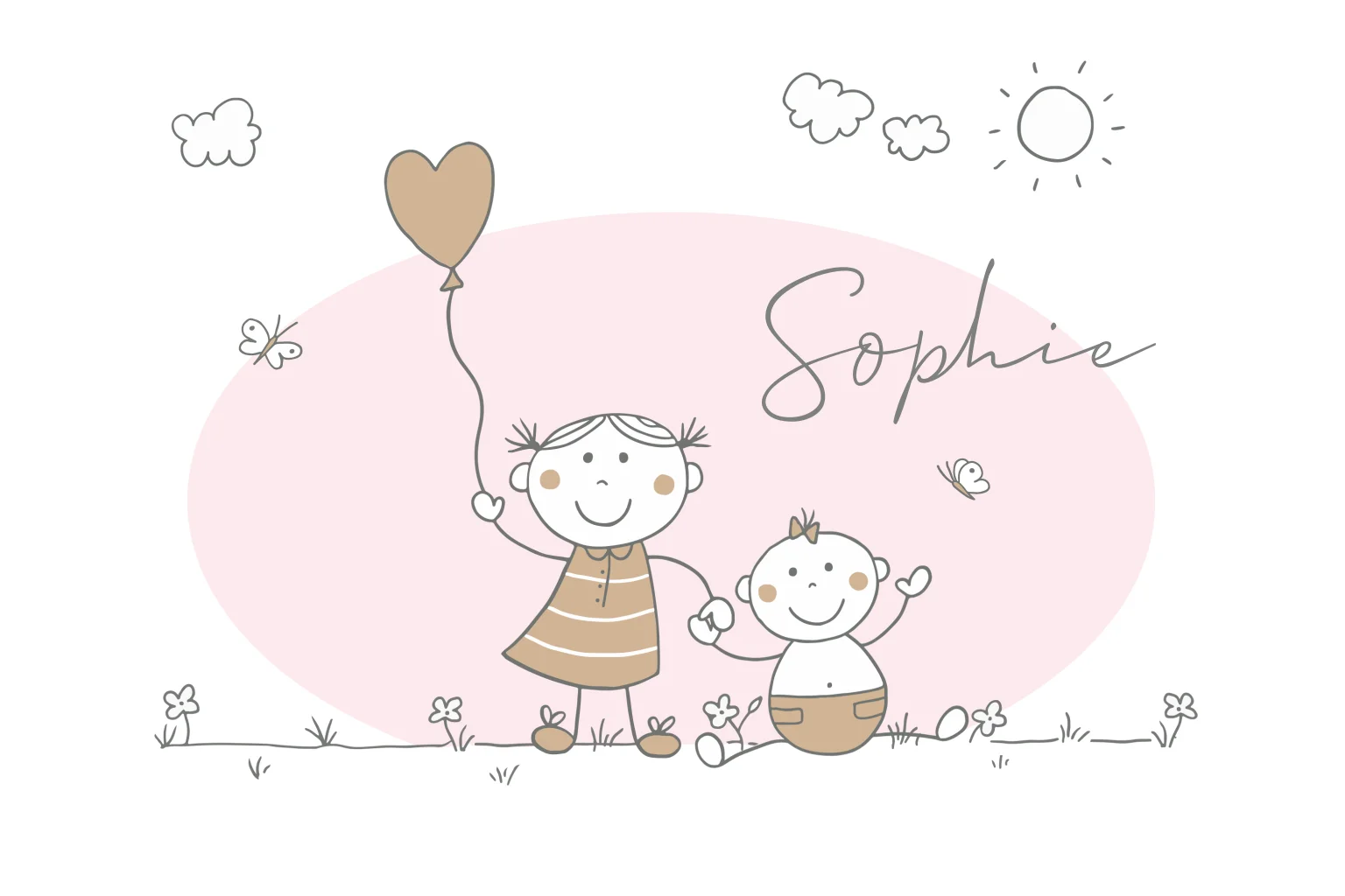 Geboortekaartje voor een meisje met een lijntekening van een baby meisje met grote zus die een ballon vasthoudt met eromheen wolkjes, de zon, vlinders en gras met bloemen op een zacht roze ovaal in de achtergrond.