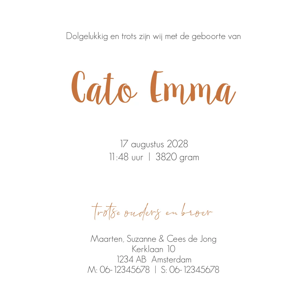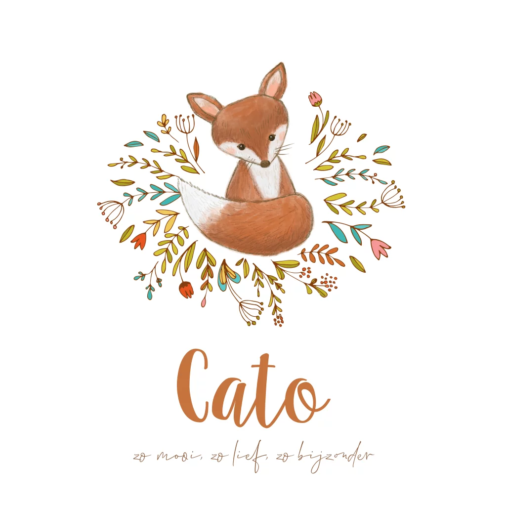 Geboortekaart voor een meisje met een illustratie van een vosje zittend in een vrolijk gekleurde bloemenkans