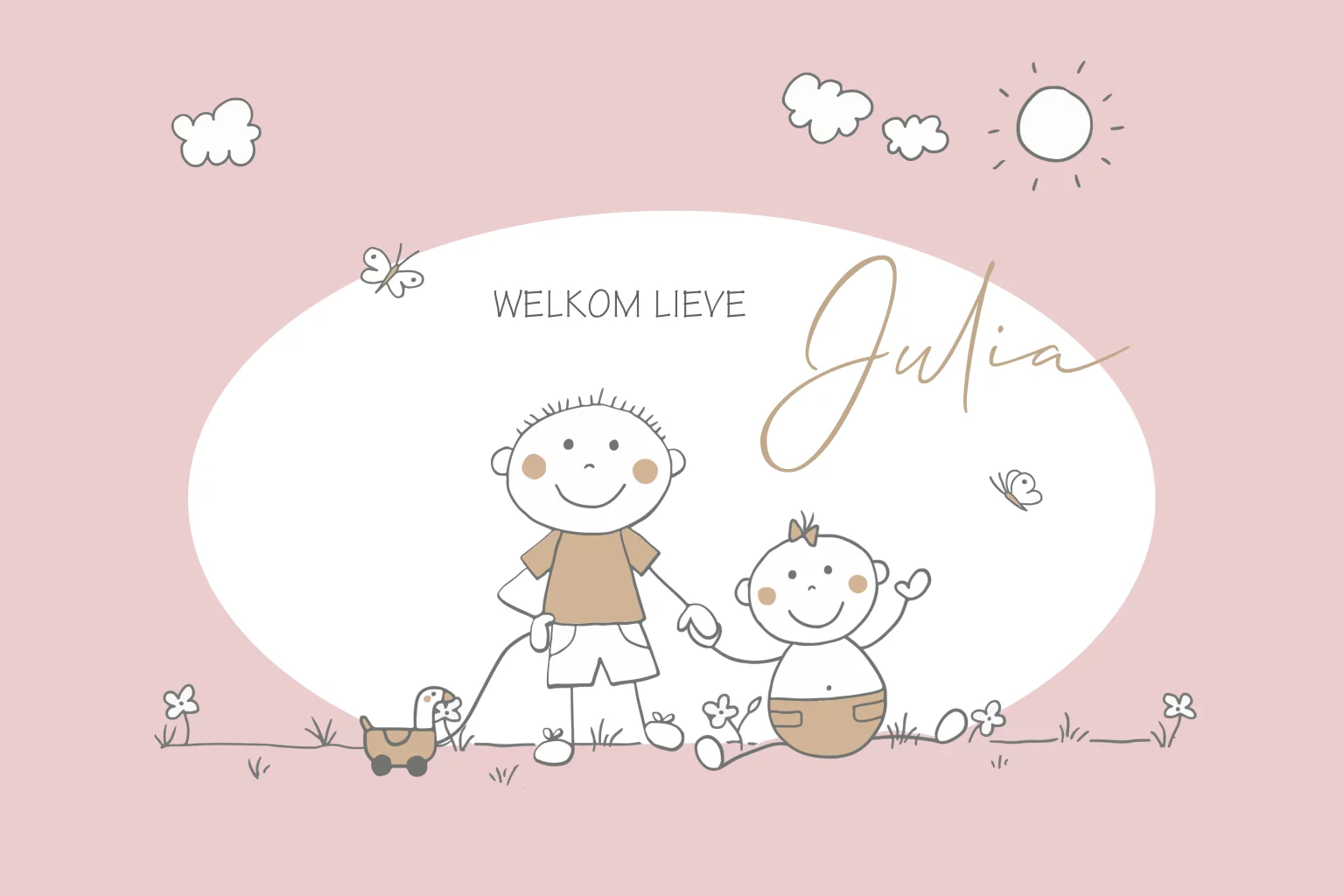 Geboortekaartje voor een meisje met in lijntekening een baby en grote broer met daaromheen wolkjes, zon vlinder gras en bloemen met een wit ovaal en een roze achtergrond.