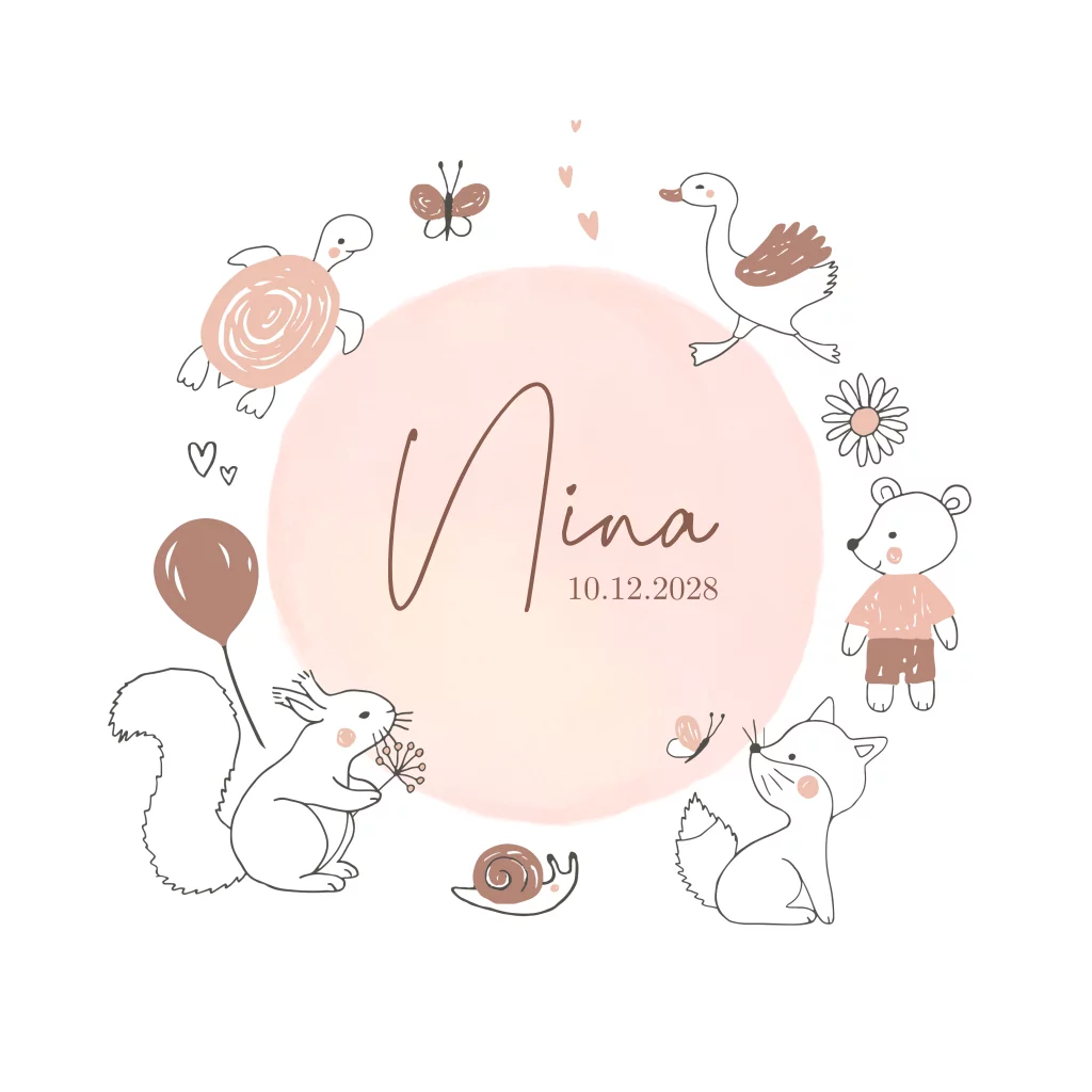 Geboortekaartje voor een meisje met hartjes, een bloem, ballon en verschillende dieren als een eekhoorn, vlinders, schildpad, beer en slak in de kleuren bruin en roze met in het midden een cirkel in roze watercolor.
