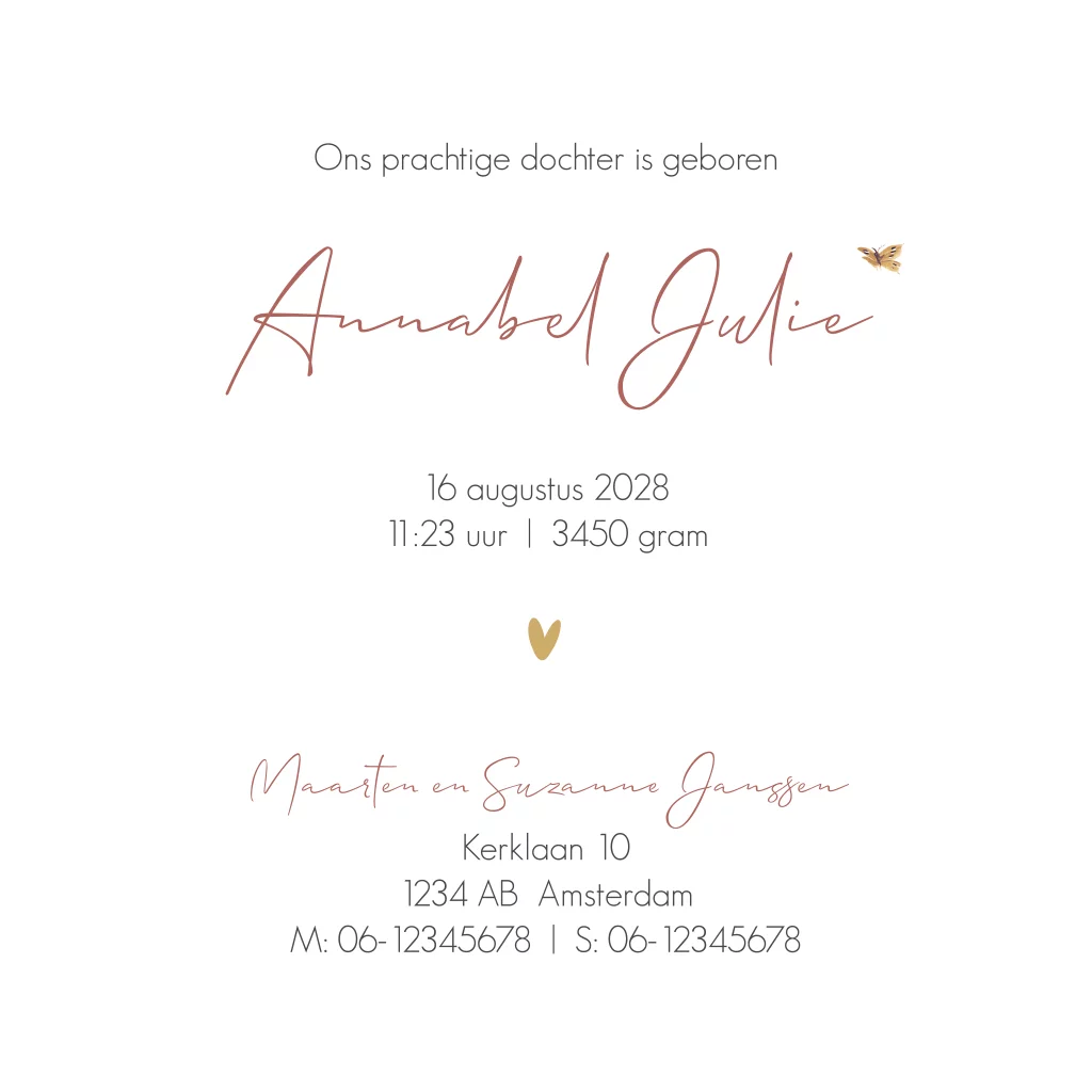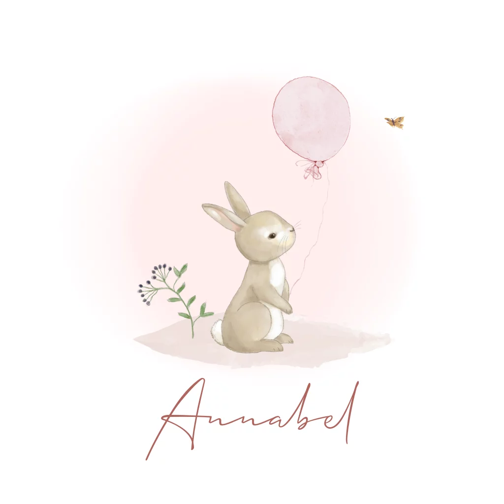 Lief geboortekaartje voor een meisje met een konijntje die een roze ballon vasthoudt met roze watercolor in de achtergrond.