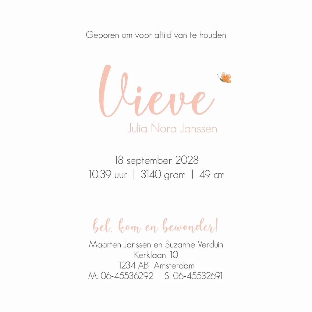 Lief geboortekaartje voor een meisje met een illustratie van een krans met herfst elementen als bloemen, takjes, blaadjes en bosdieren als een konijn, roodborstje, eekhoorn, egel, hert en goudlook spetters ertussen.