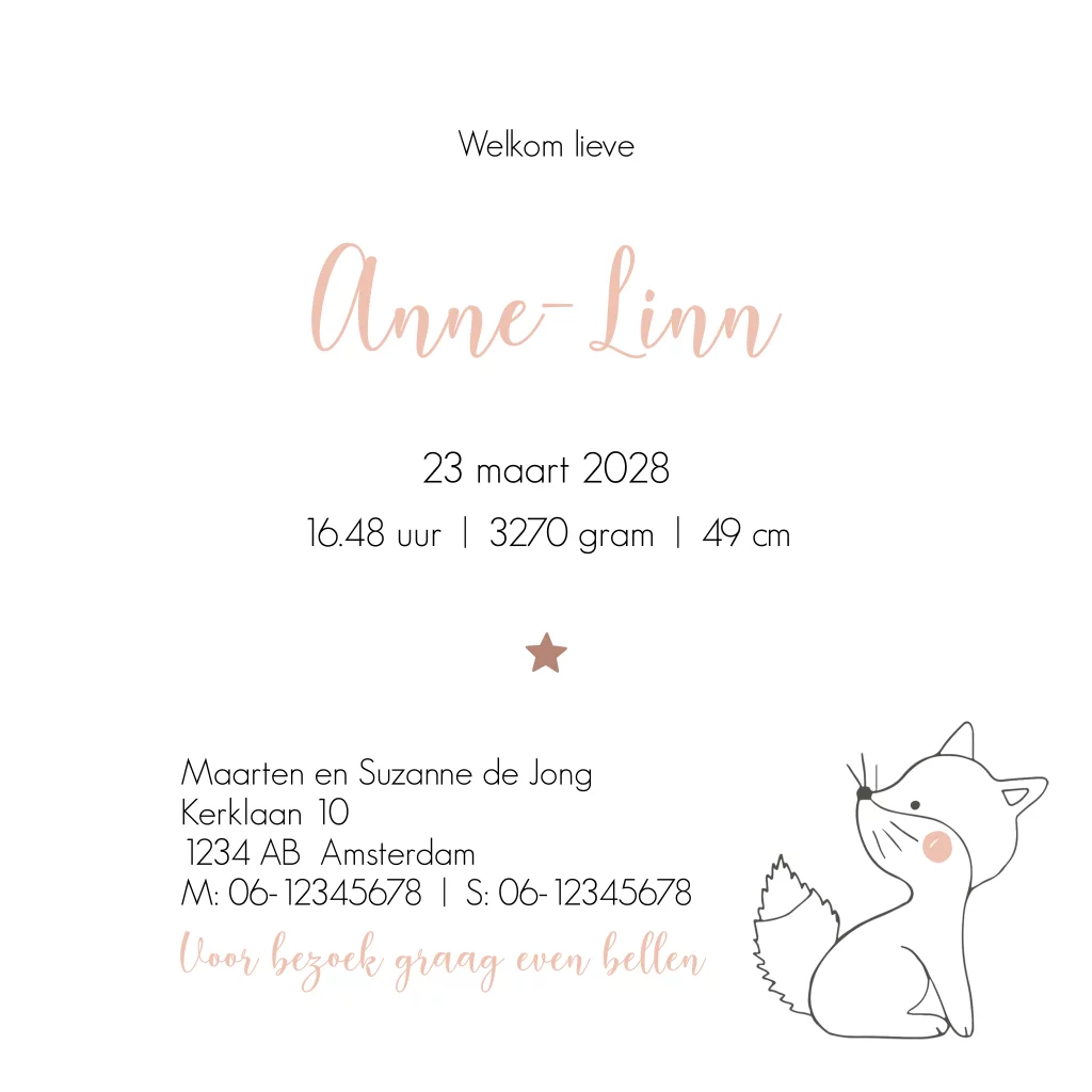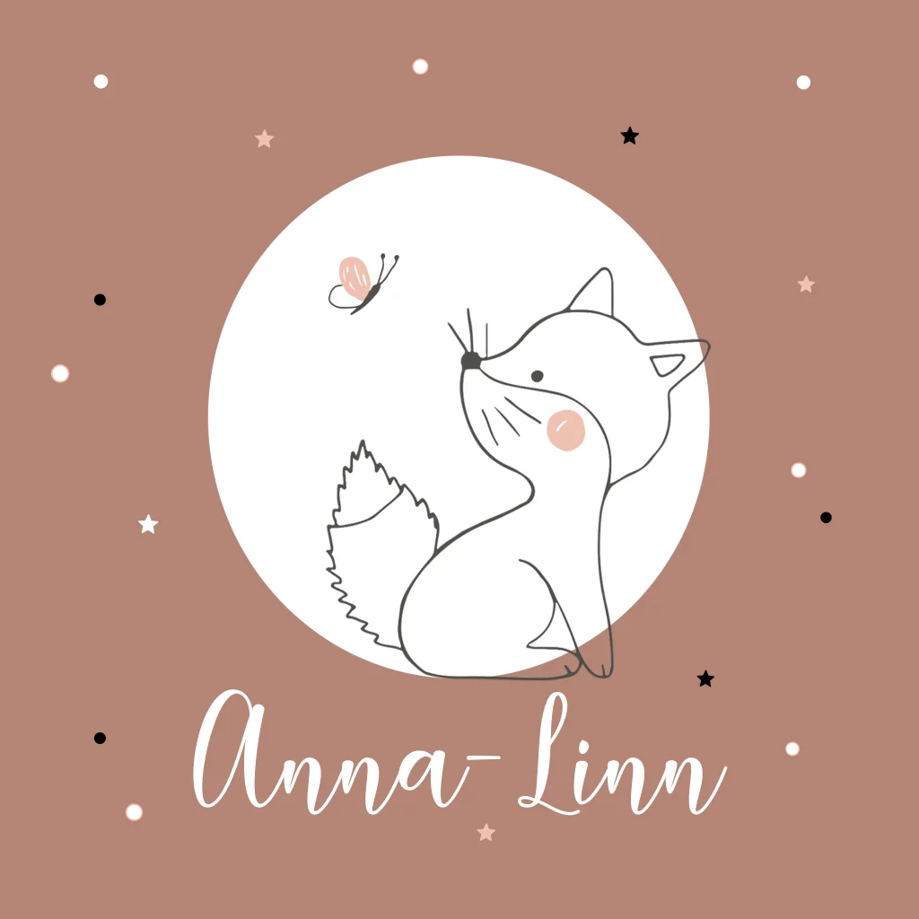 Geboortekaartje voor een meisje met een vosje in lijntekening en een lief klein vindertje met roze accent in een witte cirkel op een bruine achtergrond met stippen er sterren.