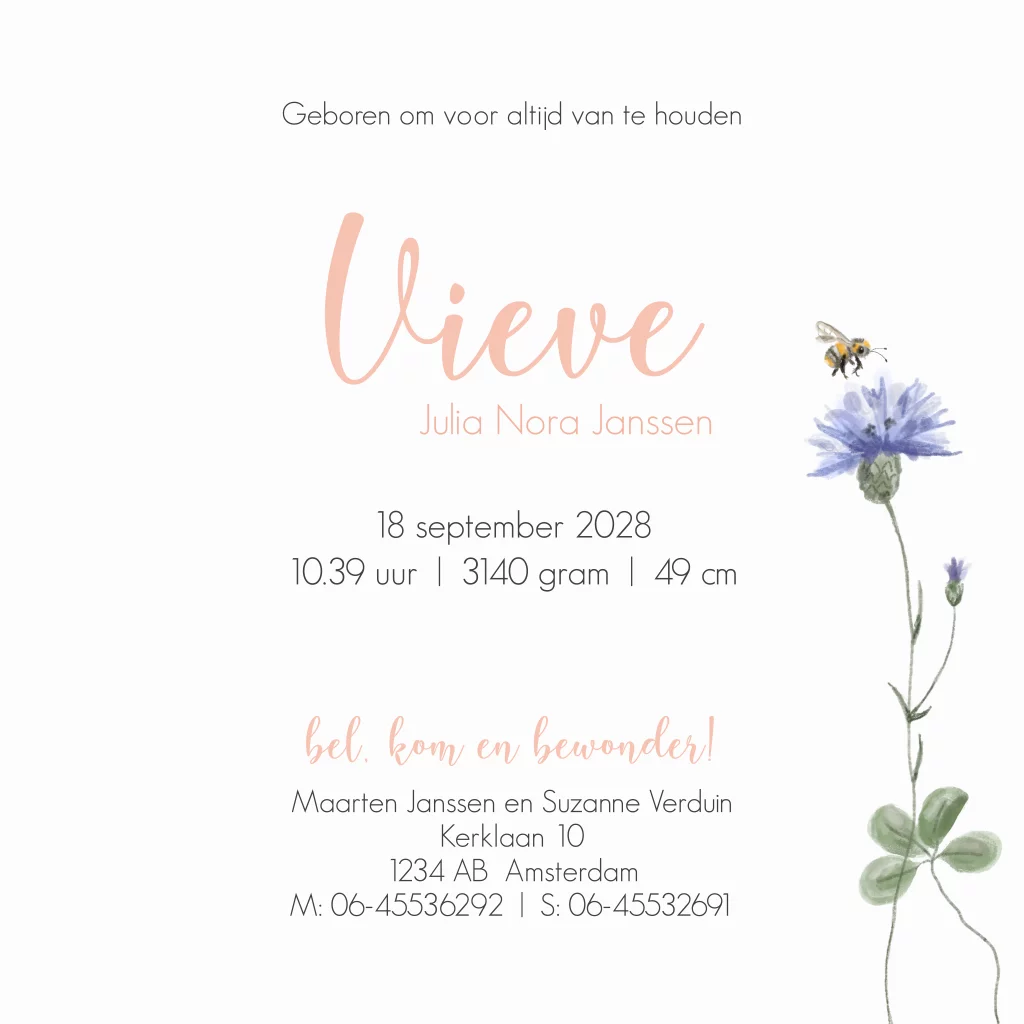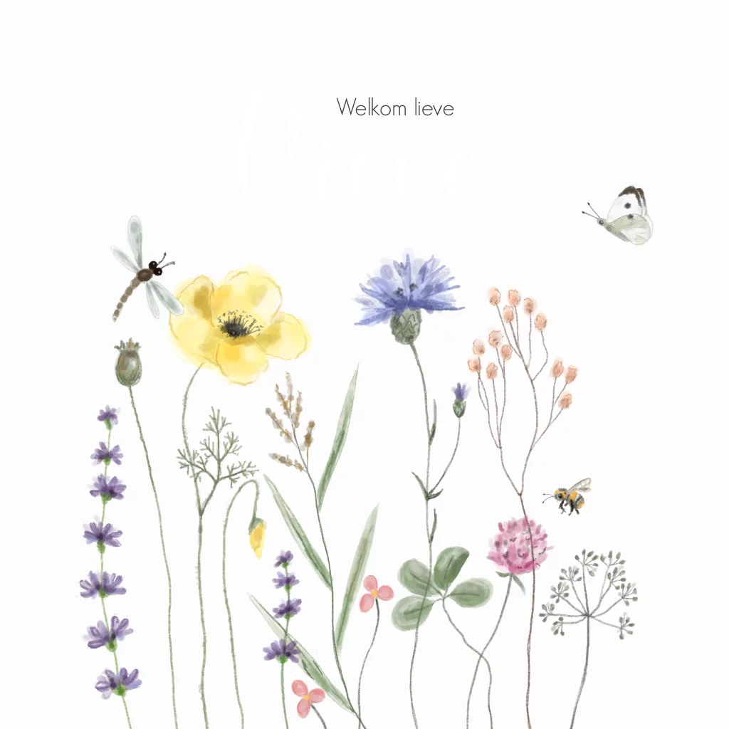 Mooi en lief geboortekaartje met verschillende veldbloemen met een vlinder en libelle en de naam in goudfolie.