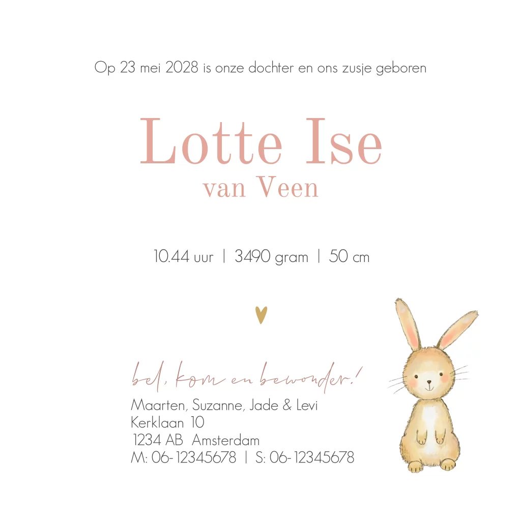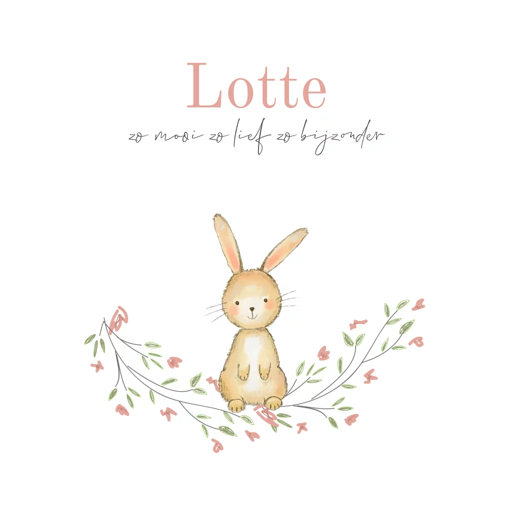 Geboortekaartje voor een meisje van een lief konijntje zittend op een takje met roze bloemetjes.