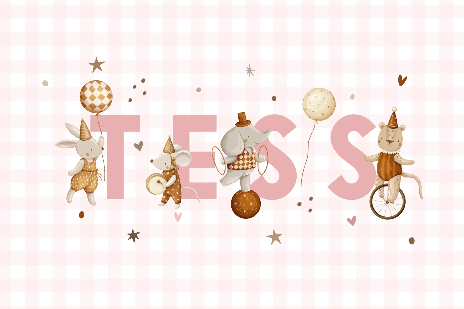 Vrolijk geboortekaartje voor een meisje met zacht roze ruitjes in de achtergrond met circus dieren naast de letters van de naam met daaromheen sterren, stippen en hartjes. De kleuren van de naam, ruitjes en de elementjes zijn aan te passen.