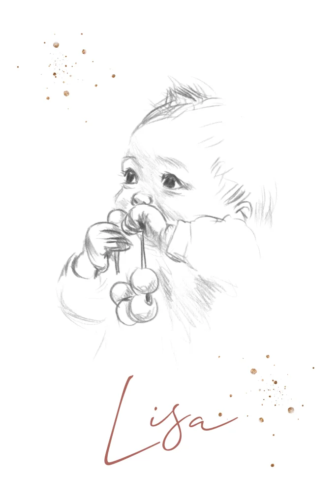 Enkel geboortekaartje met ronde hoeken met een pentekening van een baby met een kralenketting in de handen en spetters in goudlook