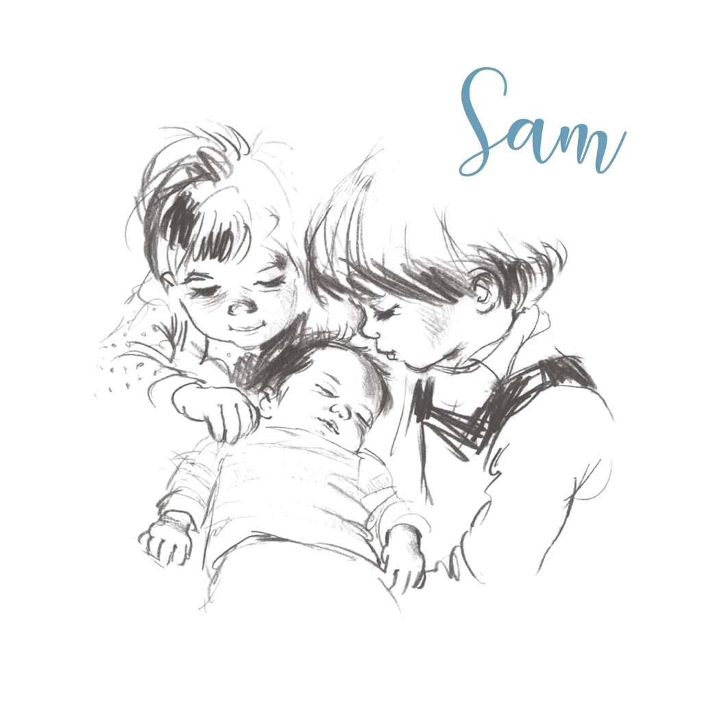Geboortekaart met een pentekening in zwartdruk van een slapende baby met een grotere broer en zus ernaast.