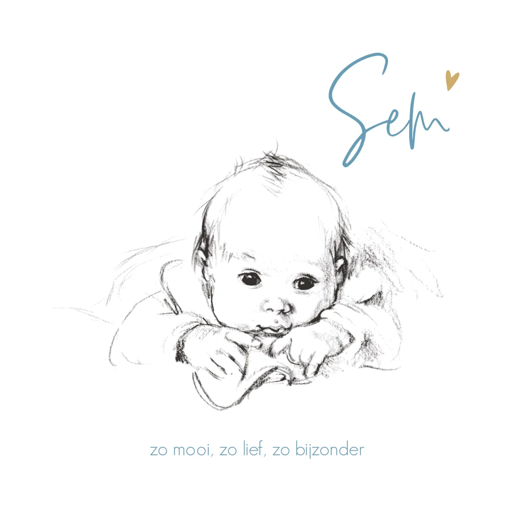Geboortekaart met een pentekening van een lieve baby liggend op de buik onder een dekentje.