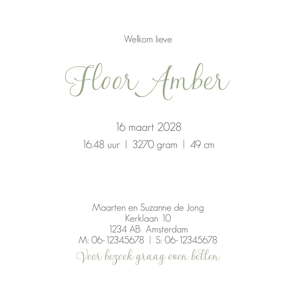 Geboortekaart met een pentekening in zwartdruk van een baby liggend op de buik kijkend naar een ezel knuffel.