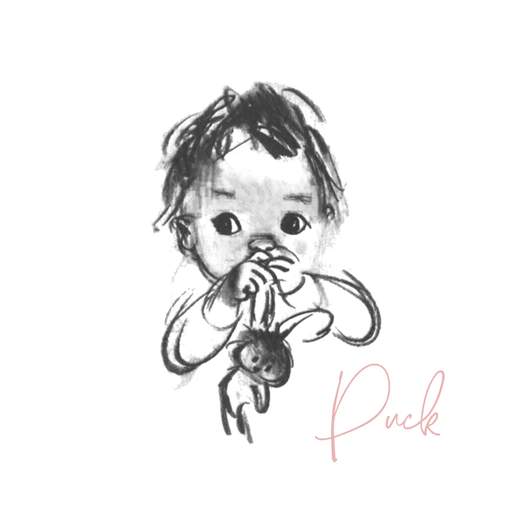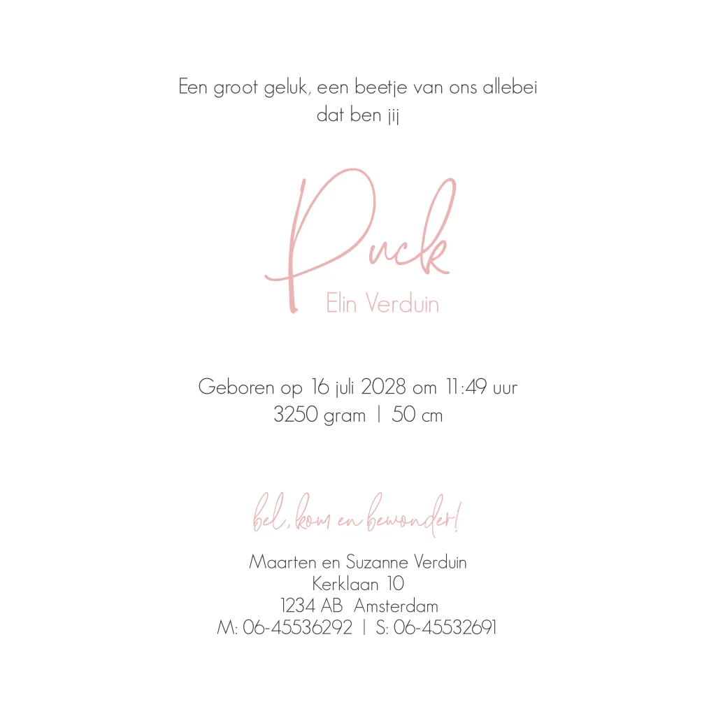 Geboortekaart met een pentekening in zwartdruk van een baby met een knuffelkonijn in de handjes