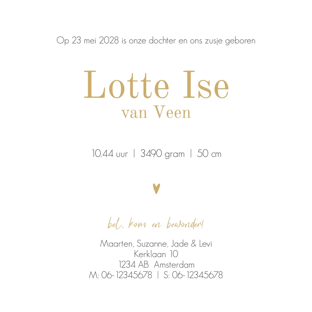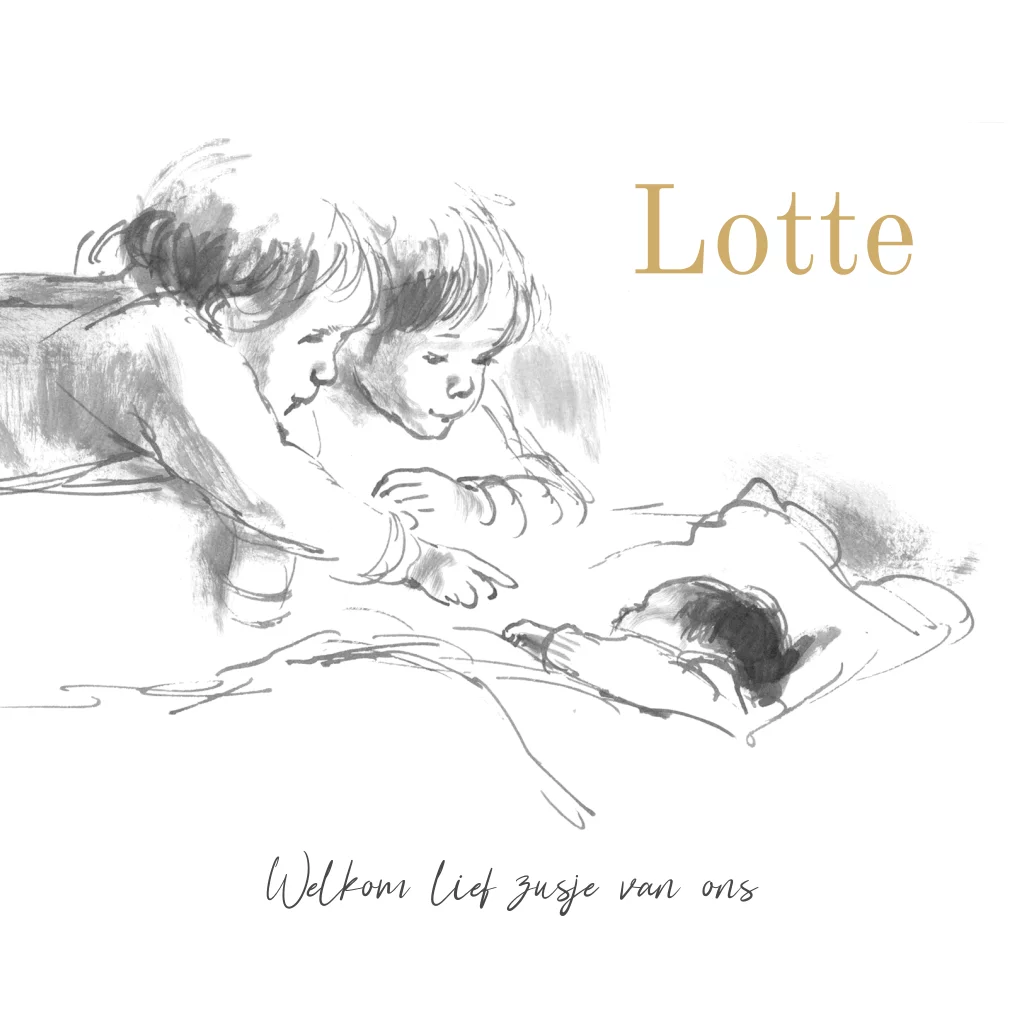 Geboortekaart met een pentekening in zwartdruk van een slapende baby met 2 groter kindjes die over het randje van de wieg naar de baby kijken.