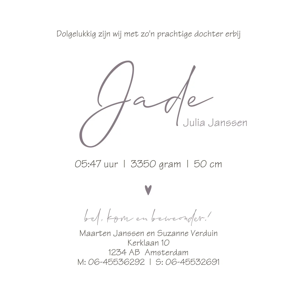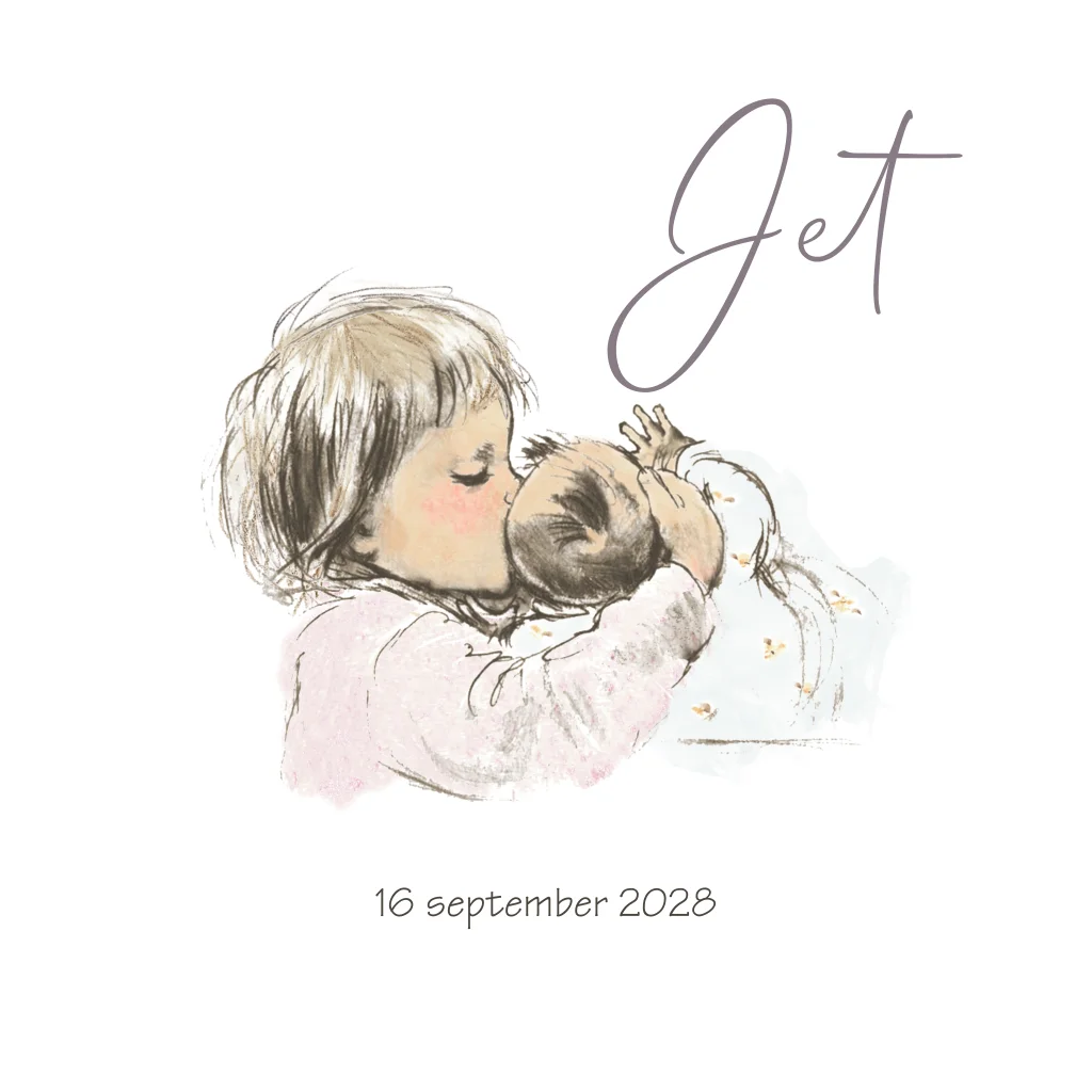 Geboortekaart met een pentekening in kleur van een baby in de armen van een grote zus die een kus op het hoofdje van de baby geeft.