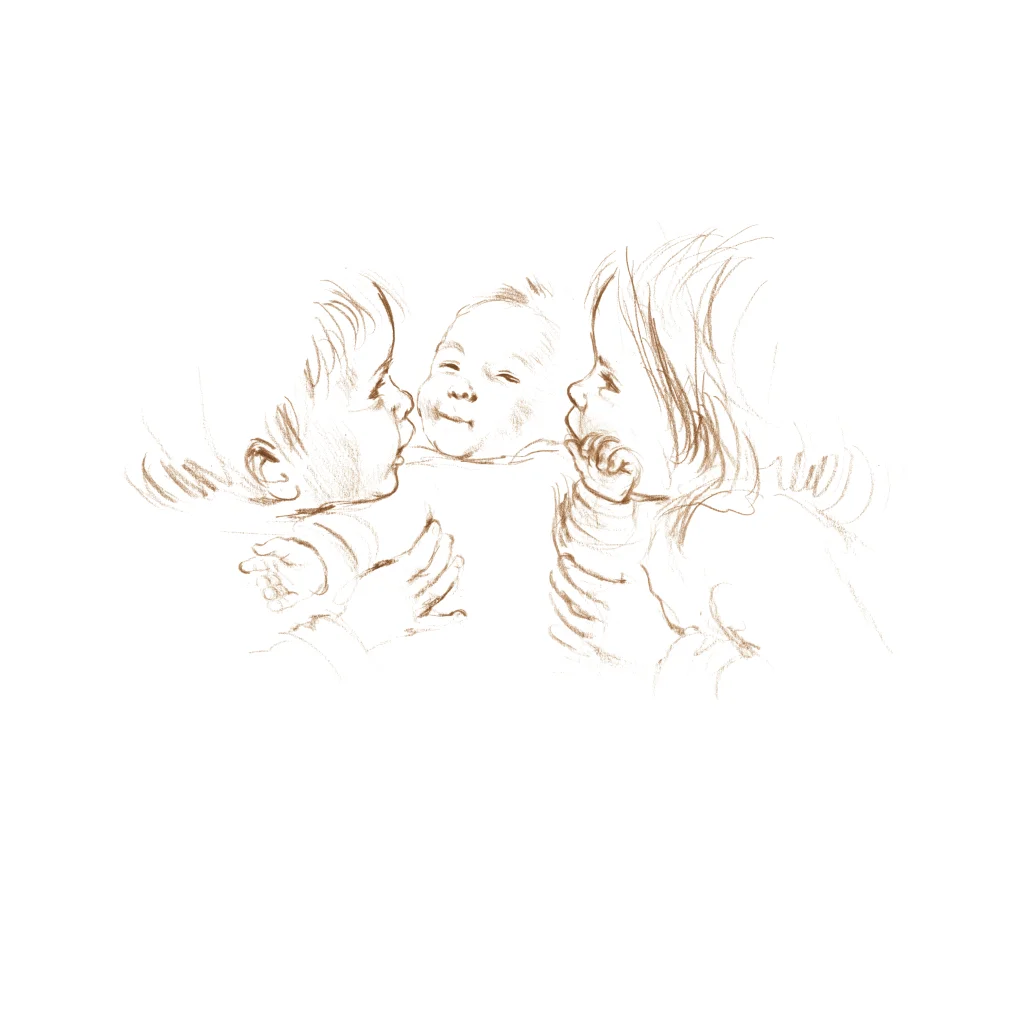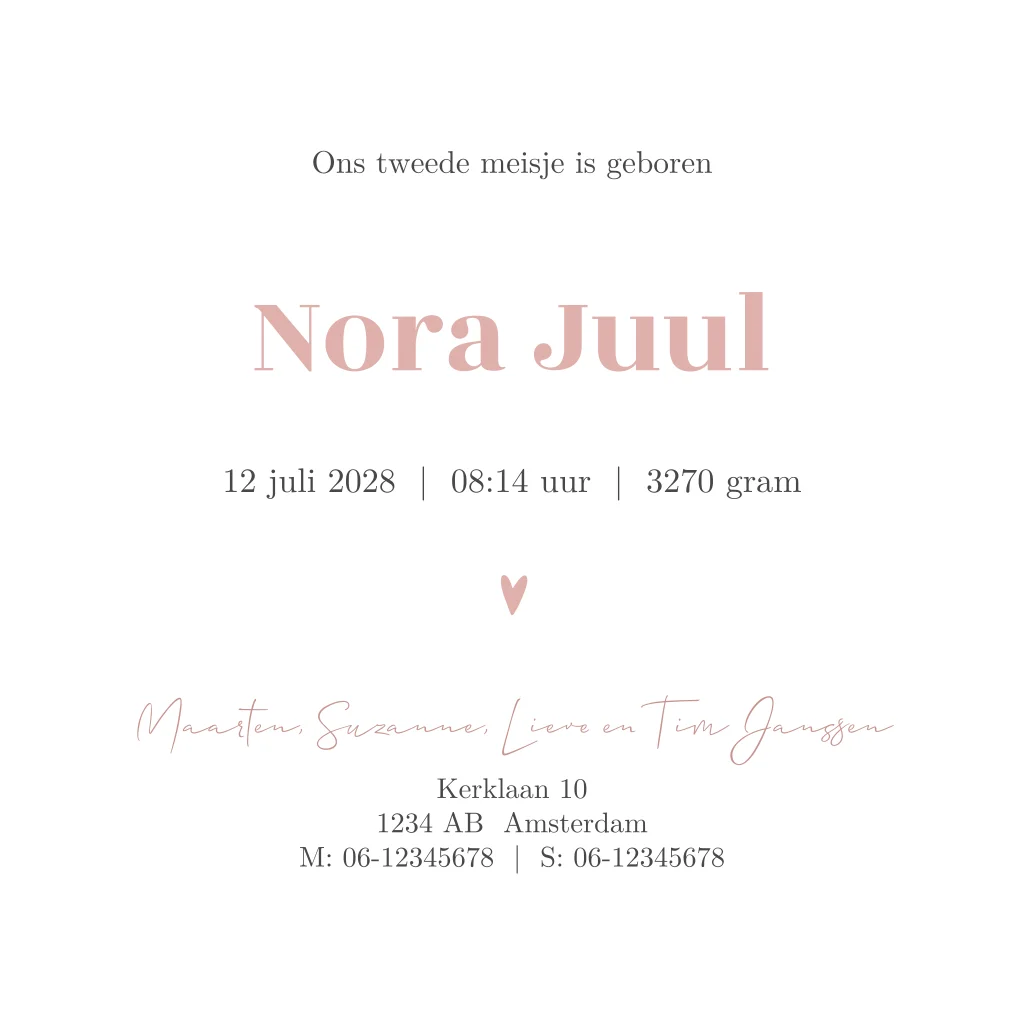 Geboortekaart met een mooie pentekening in sepia voor een 3e kindje met de naam, een hartje en spetters in roségoudfolie.