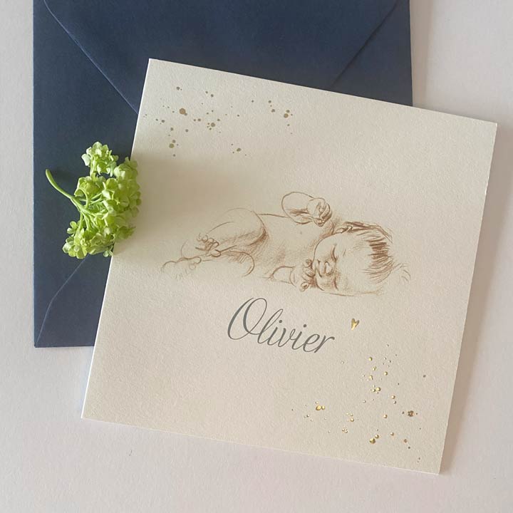 Geboortekaart slapende baby sepia pentekening goudfolie