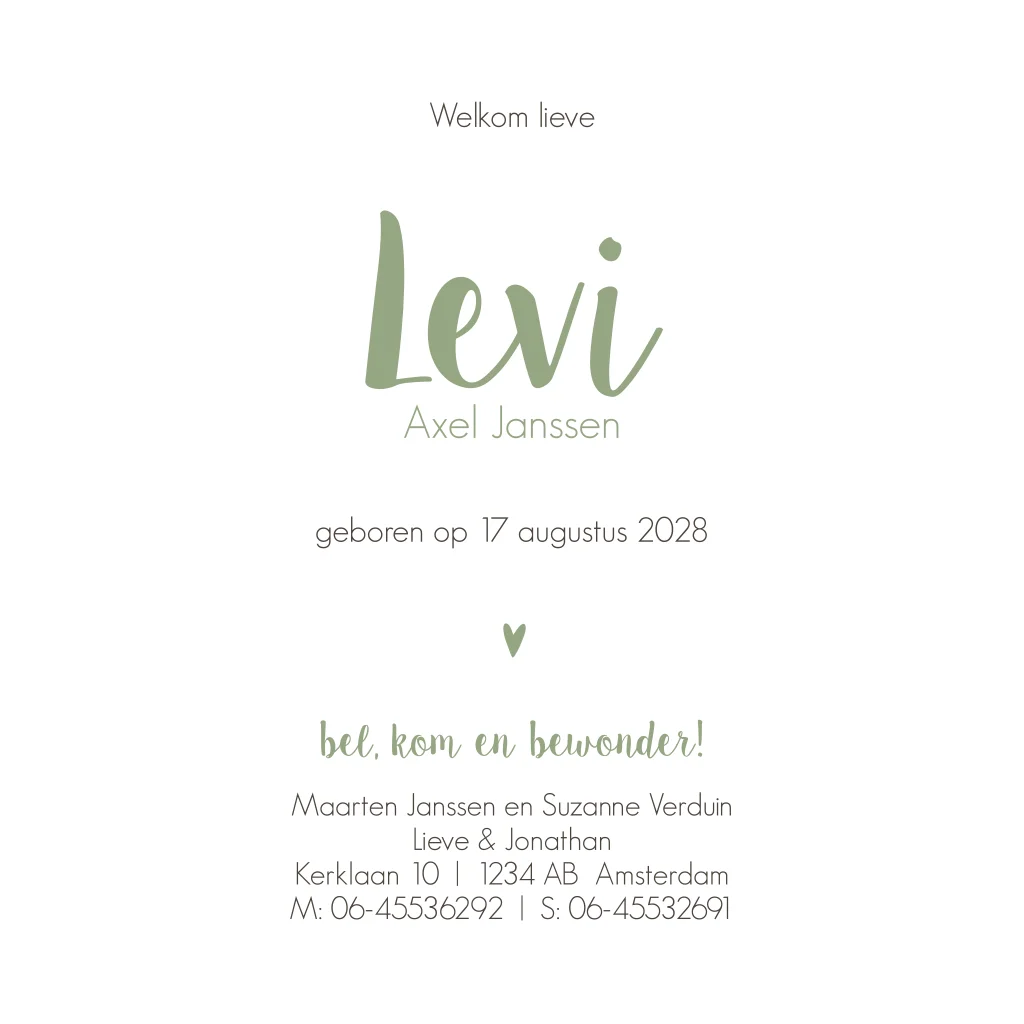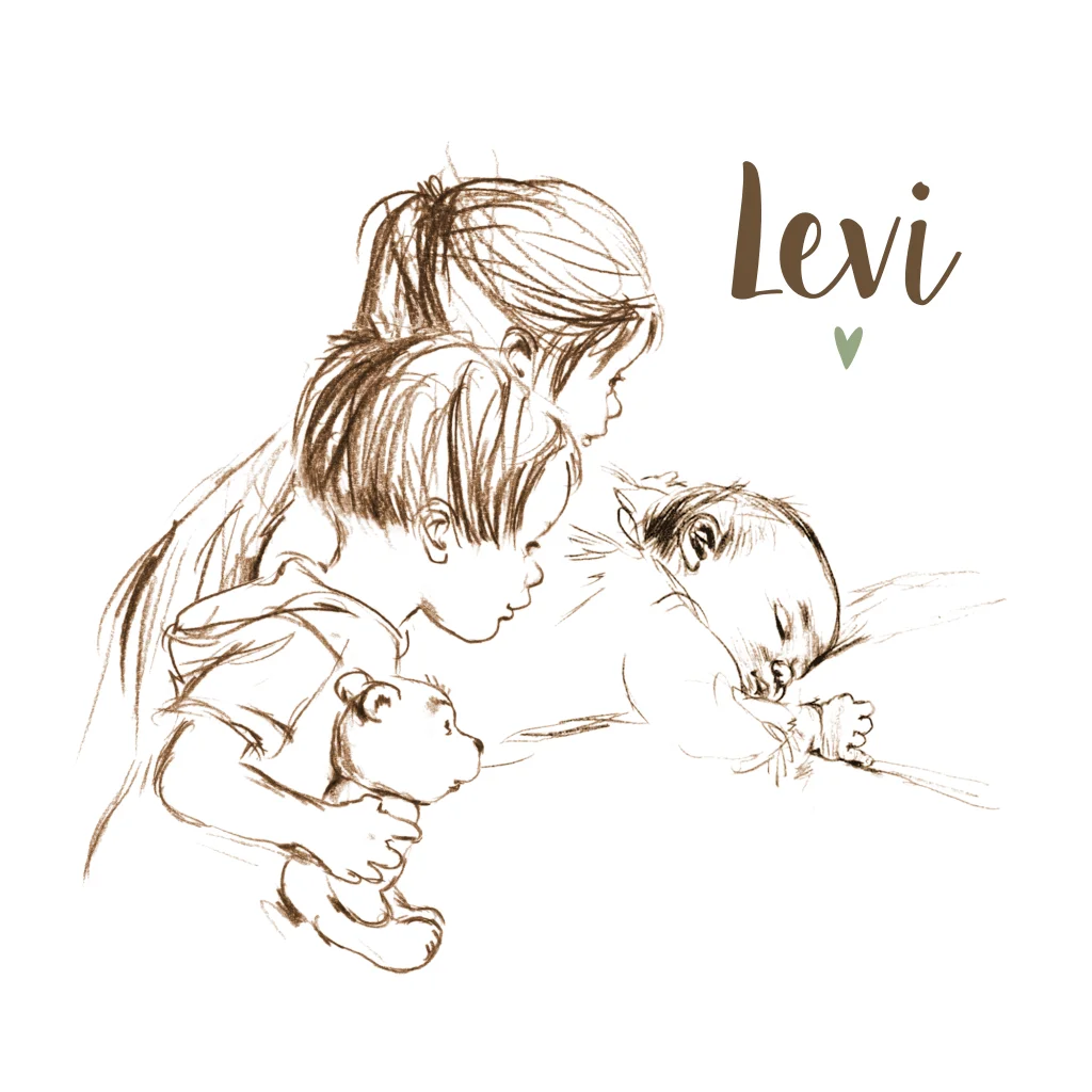 Geboortekaart met een pentekening in sepia bruindruk van een slapende baby met een grotere zus en broer die over de baby heen gebogen staan.