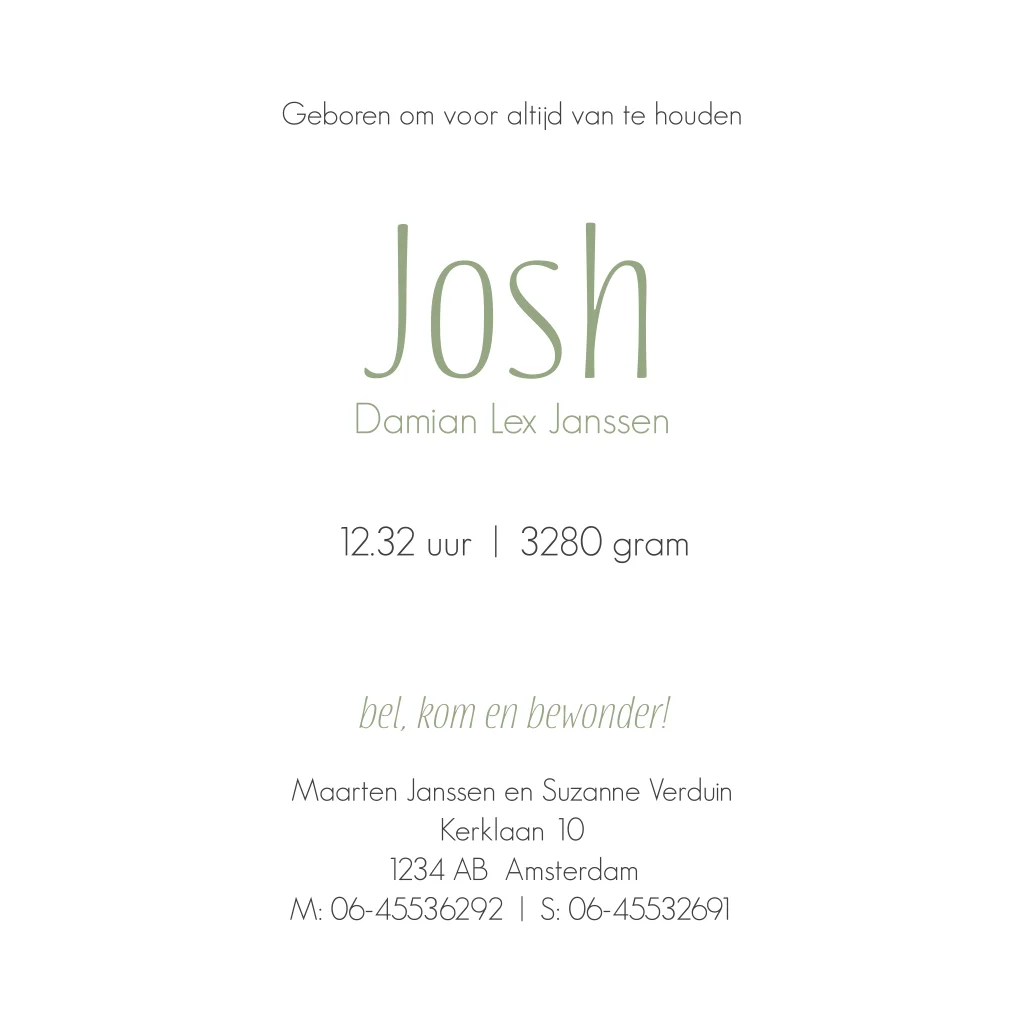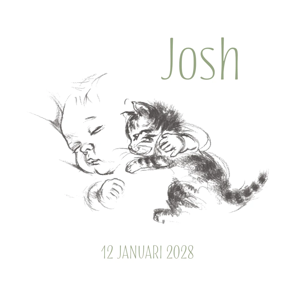 Geboortekaartje met een pentekening in zwartdruk van een slapende baby met een kat onder de arm.