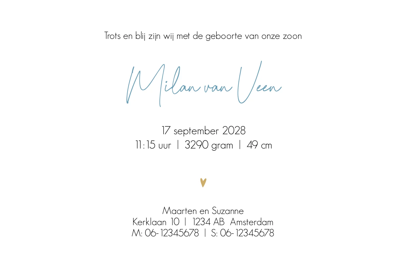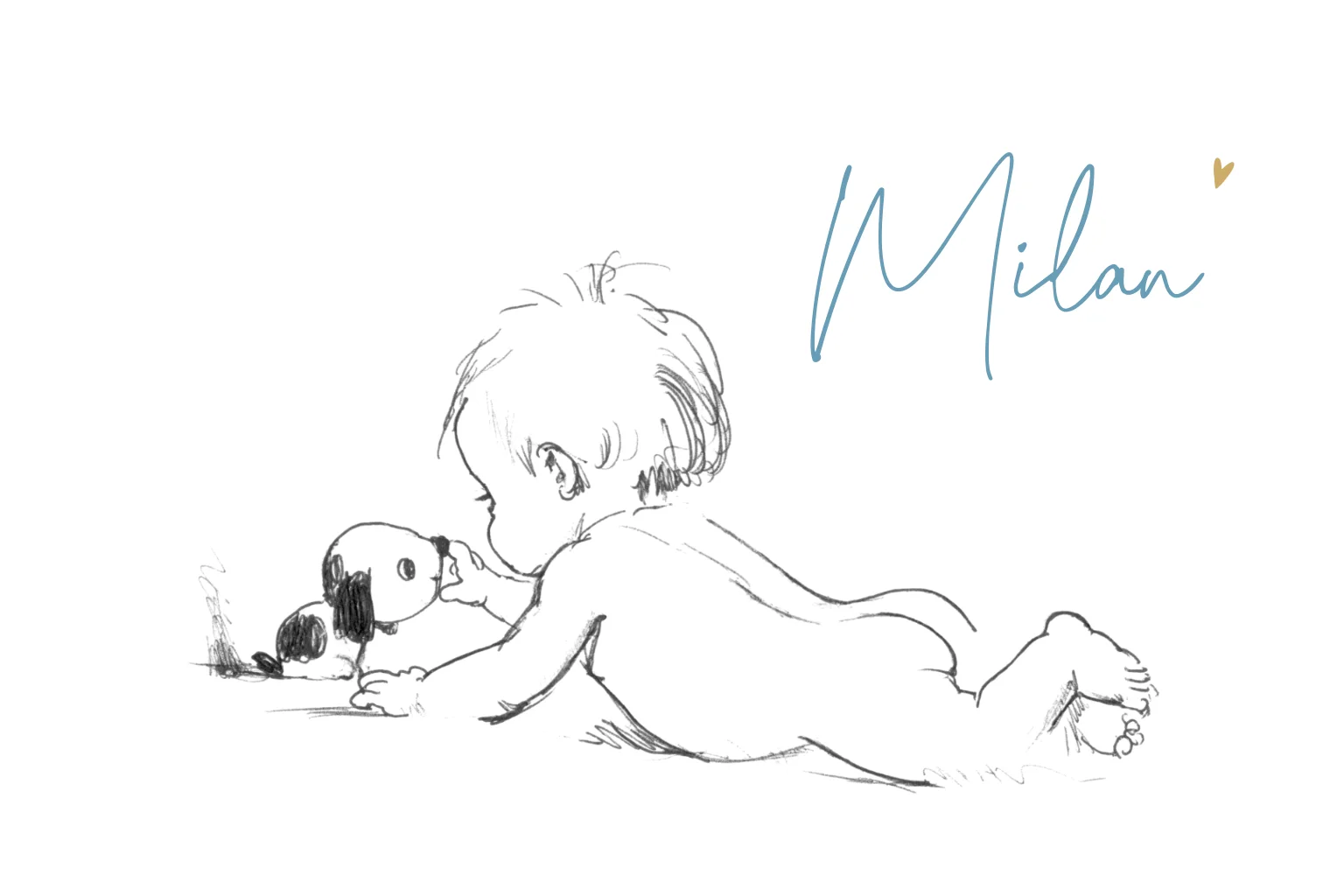 Geboortekaartje met een pentekening in zwartdruk van een op de buik liggende baby met een knuffelhondje.