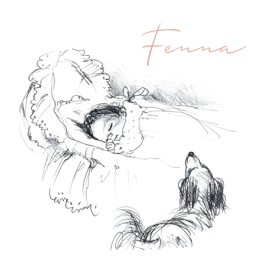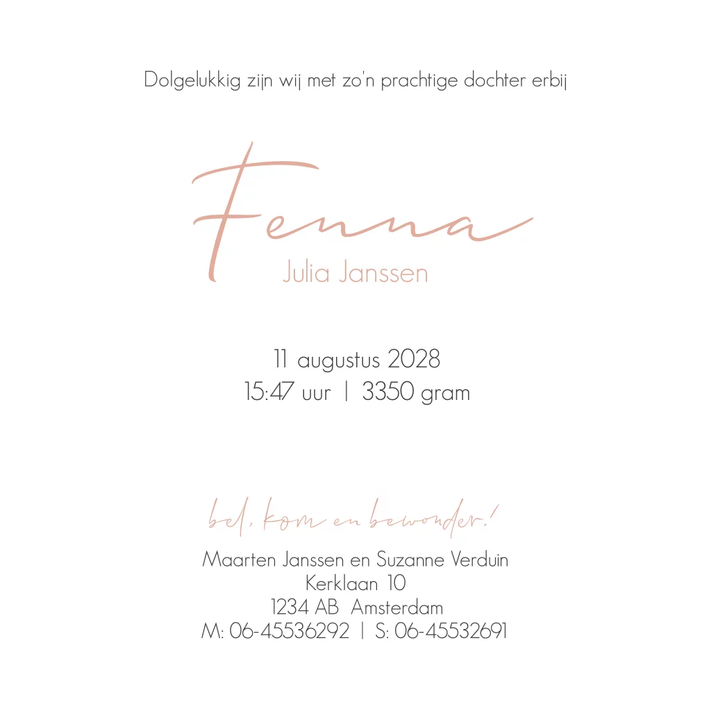 Geboortekaartje met een pentekening in zwartdruk van een baby slapend in een wiegje met een hond die naar de baby kijkt.
