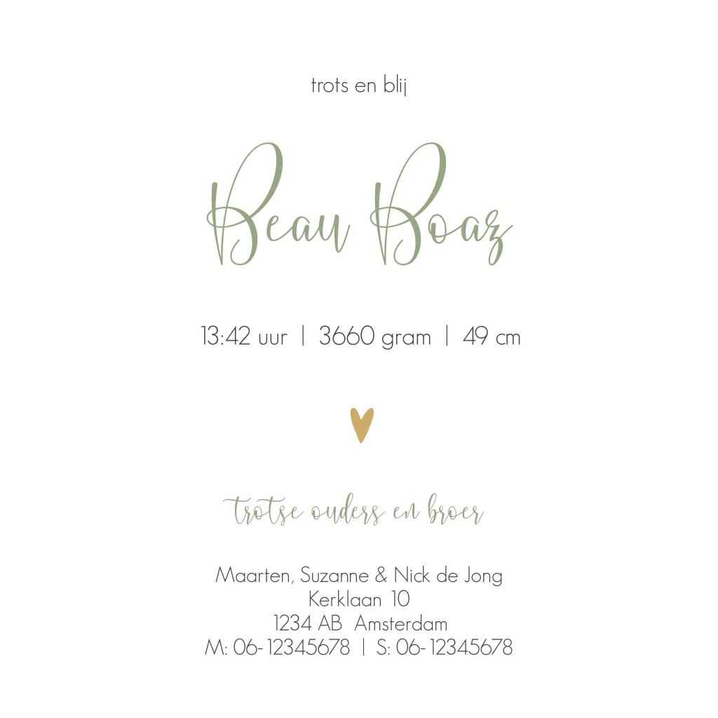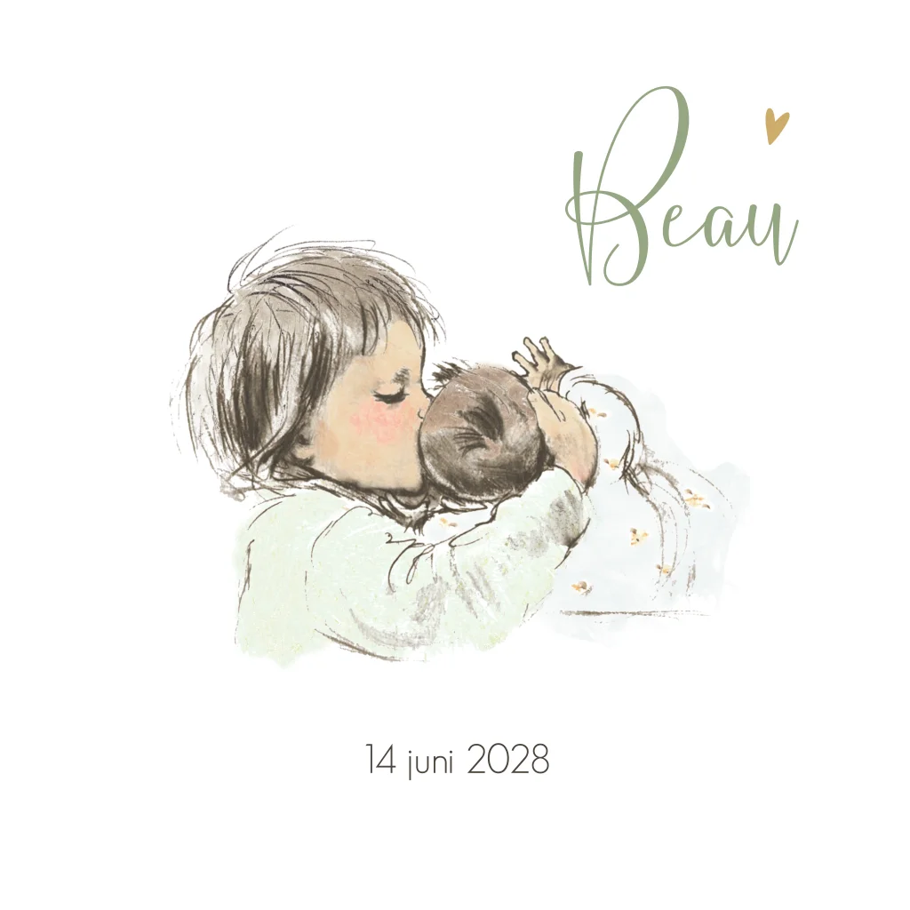Geboortekaartje met een pentekening in kleur van een grote broer die de baby in zijn armen houdt en een kus op het hoofdje geeft. Bij de naam staat en klein goudkleurig hartje.