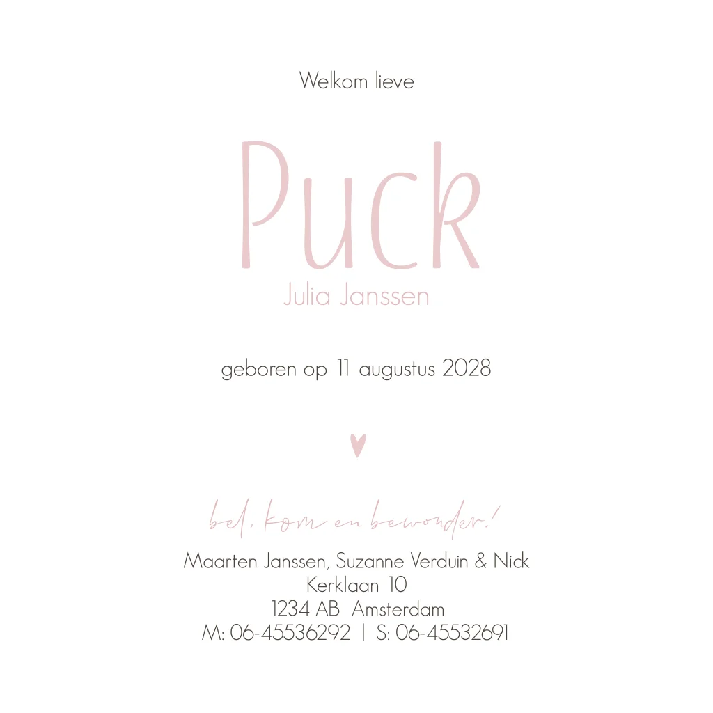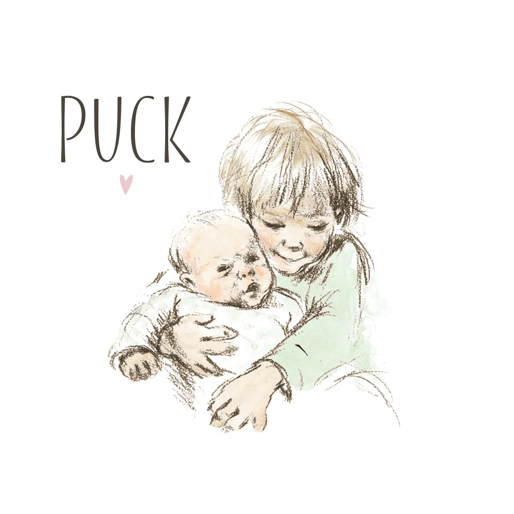 Geboortekaartje met een pentekening in kleur van een grote broer of zus die de baby heel lieflijk in zijn armen vasthoudt.