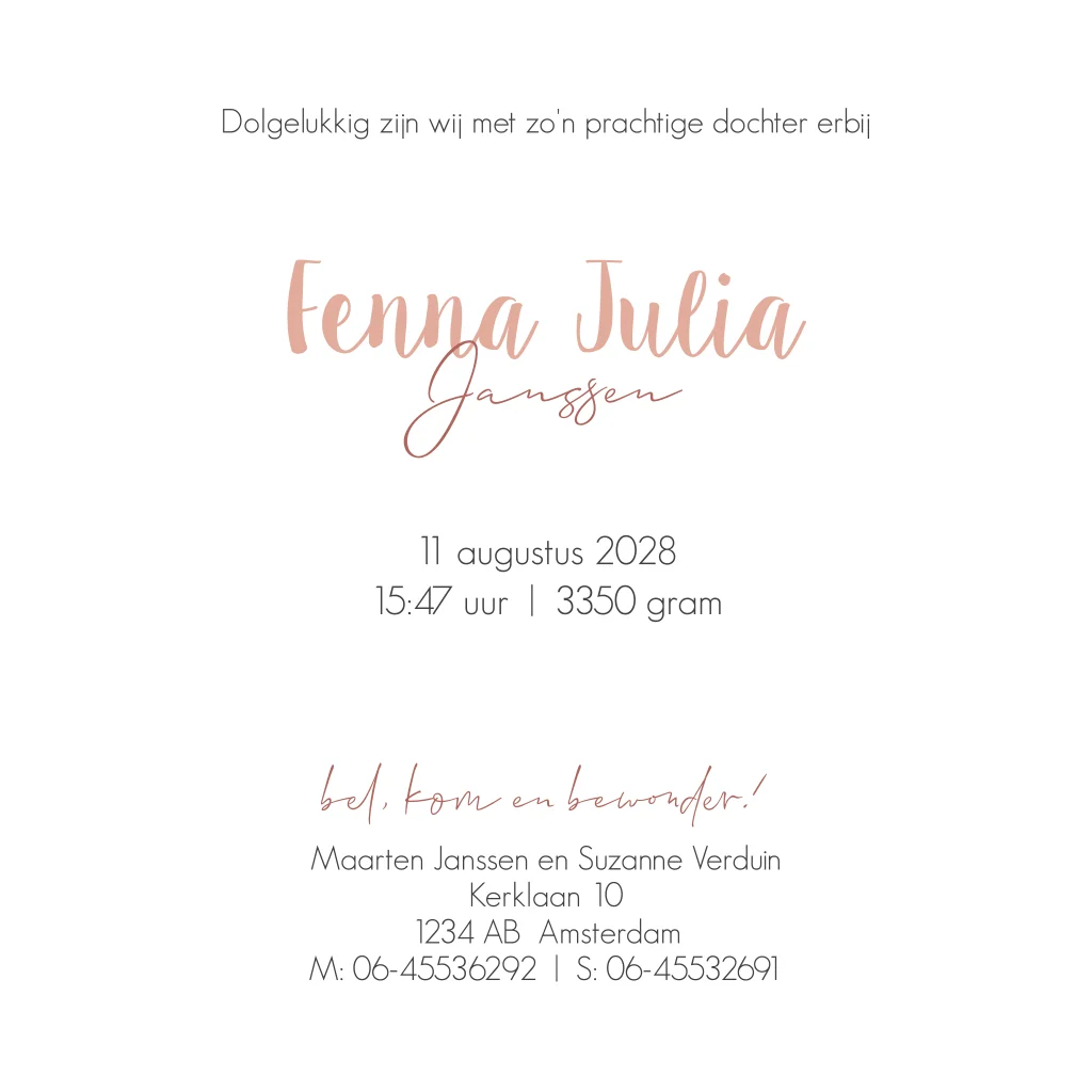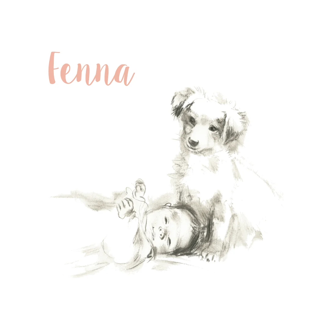 Lief geboortekaartje met een pentekening van een baby liggend op de rug naast een hond.