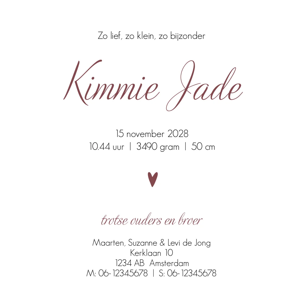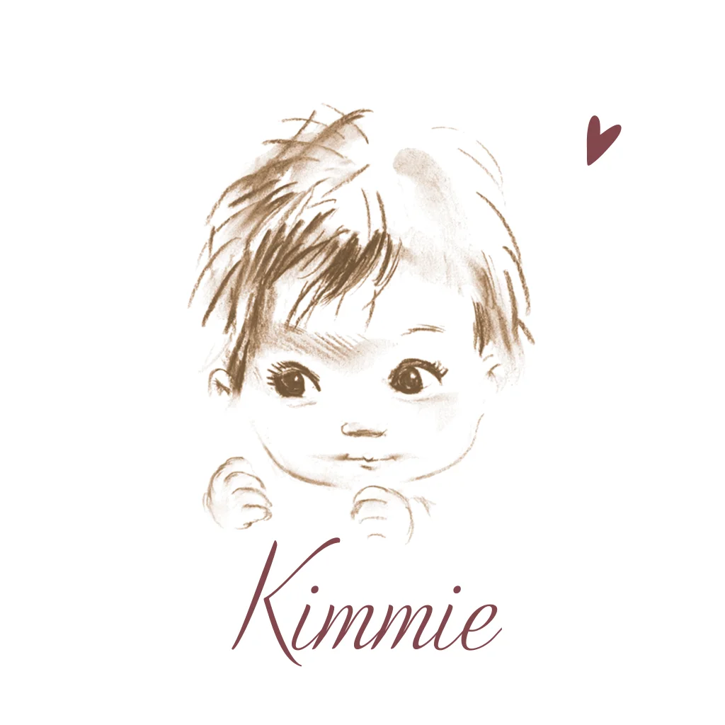 Geboortekaartje met een pentekening in sepia bruindruk van een lief baby hoofdje met 2 kleine handjes.